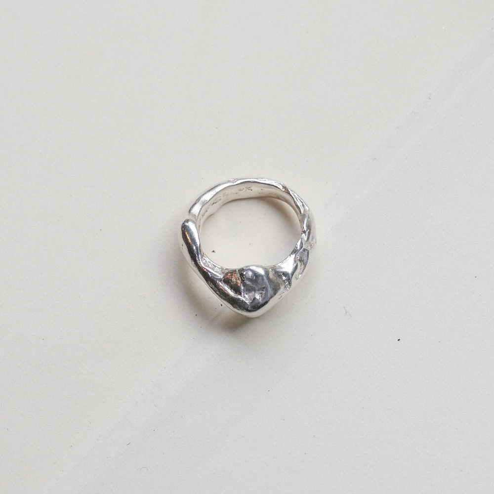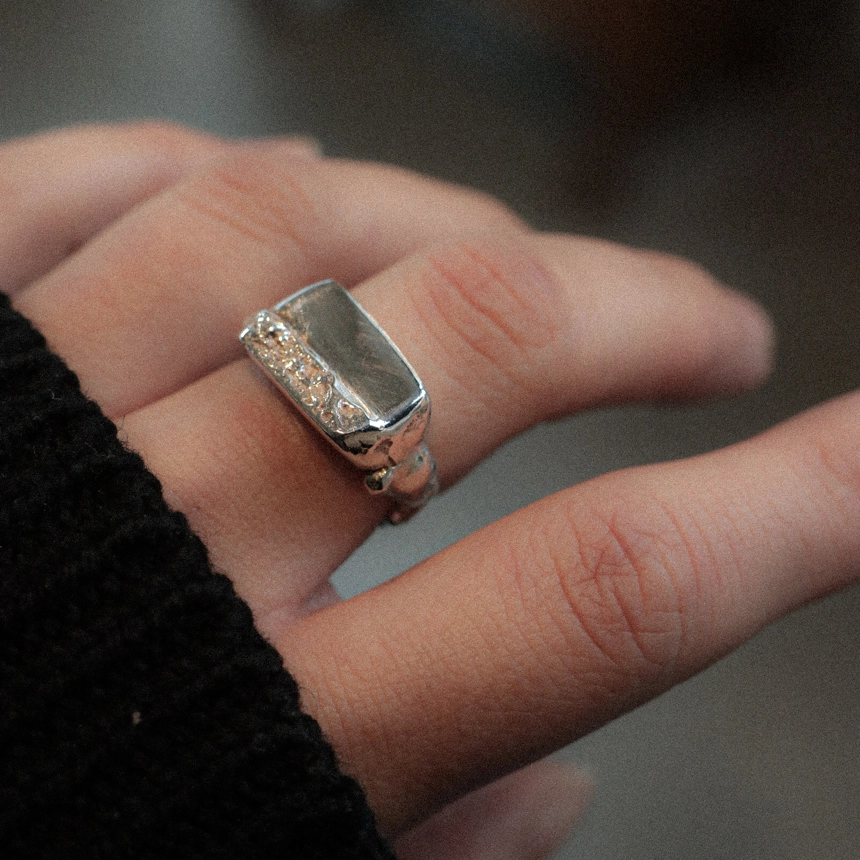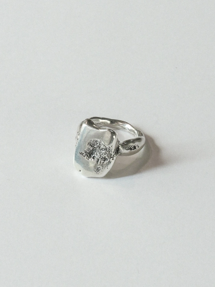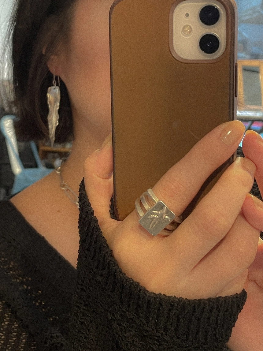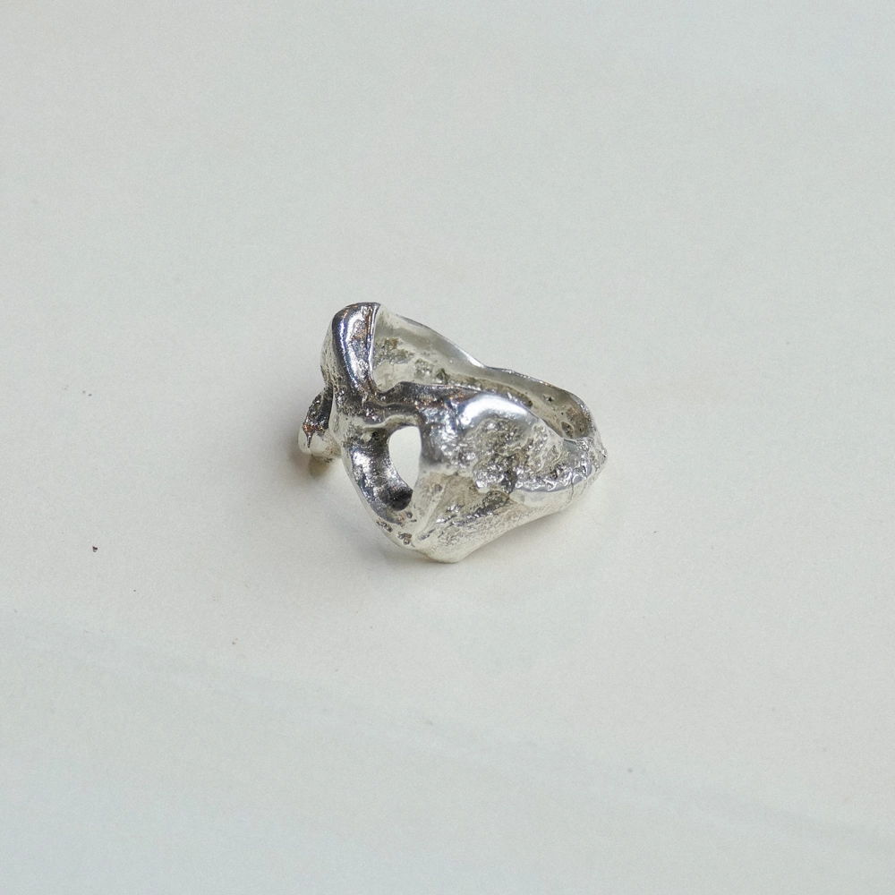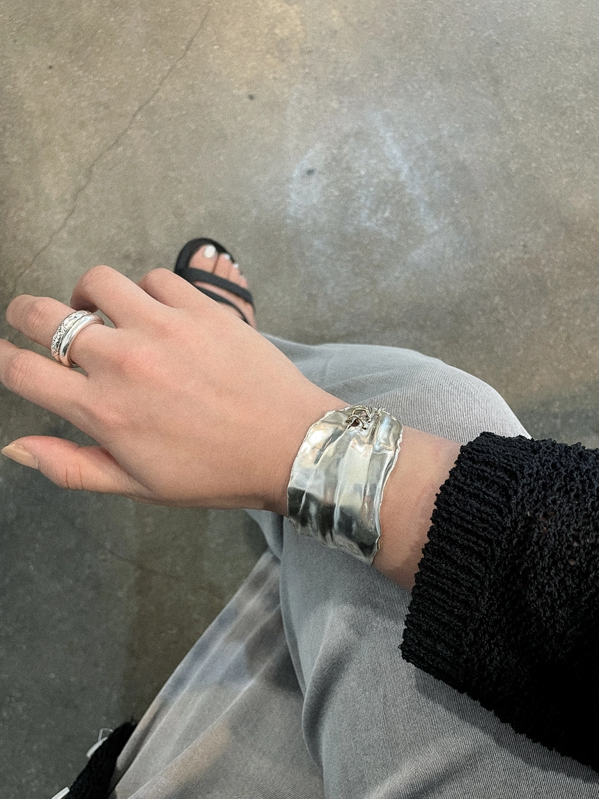 빛을 머금은 듯한 표면 처리와 99.9% 순은을 활용한 강한 존재감, 그리고 직접 조각한 듯한 투박한 디테일이 돋보입니다.