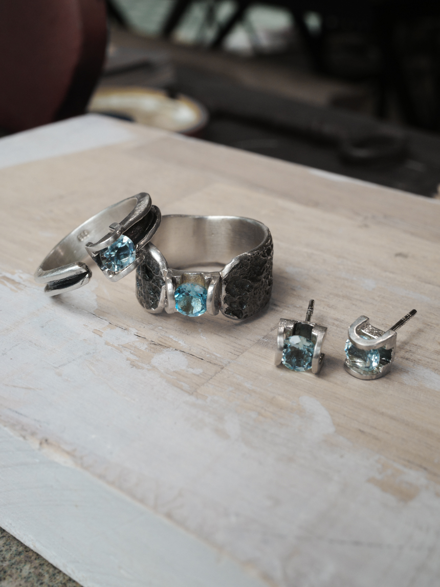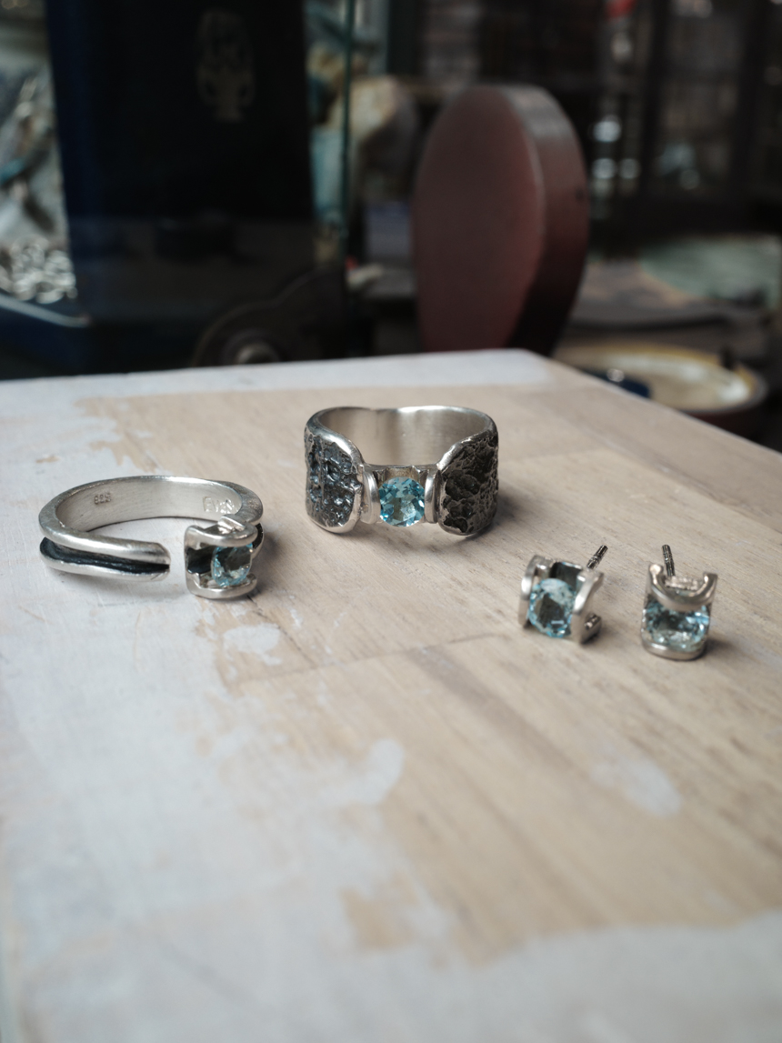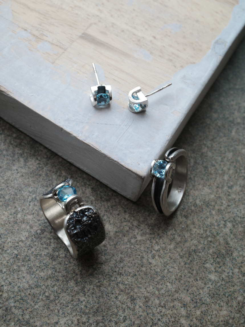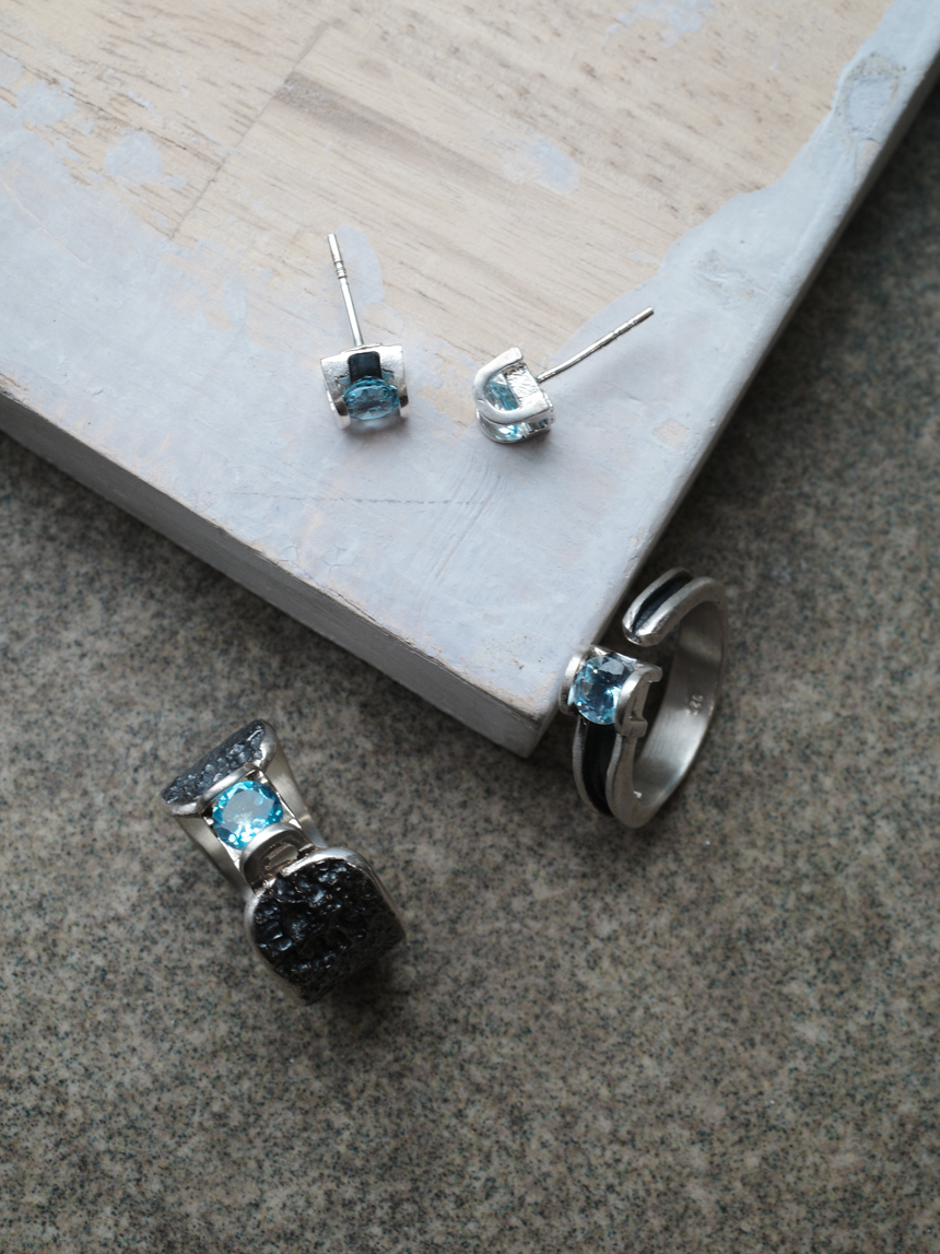 다양한 각도에서 빛나는 컷팅과 푸른 원석의 컬러가 아름다운 스위스토파즈 귀걸이