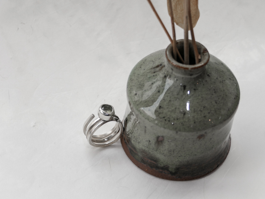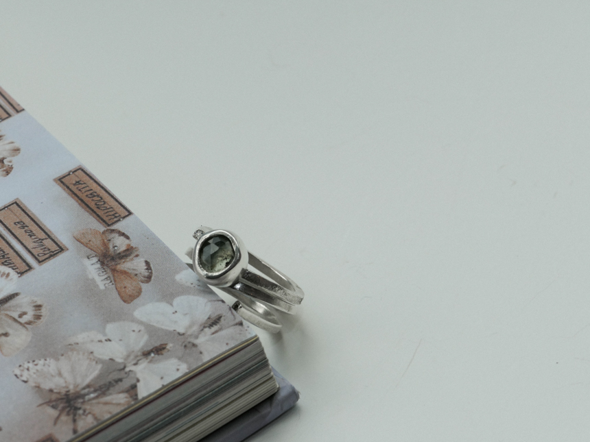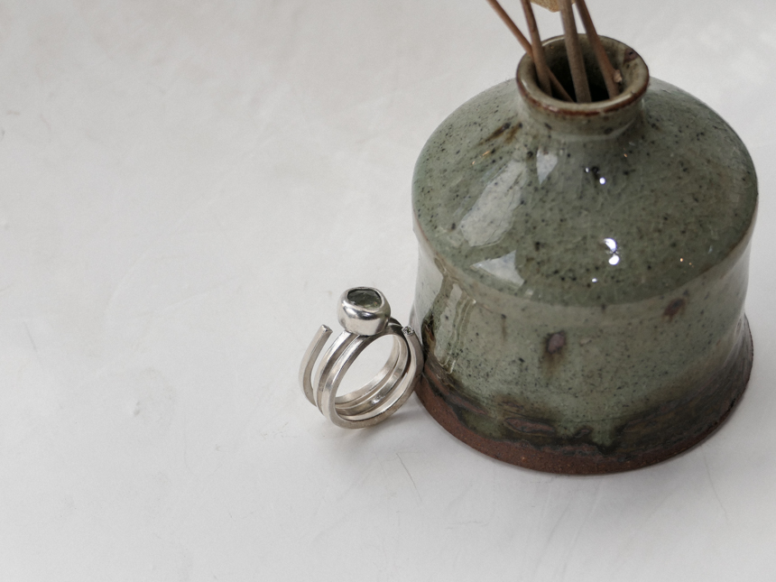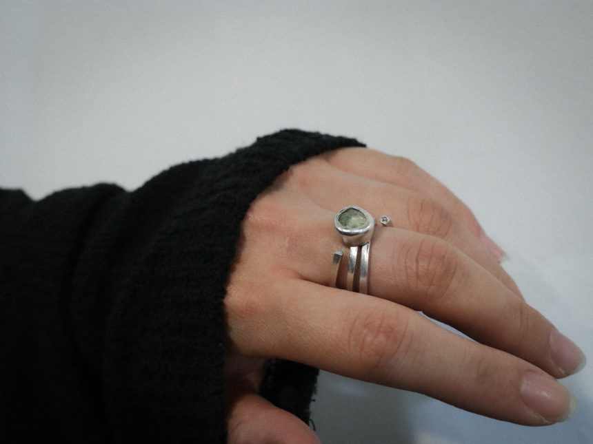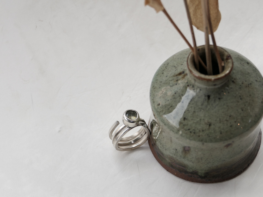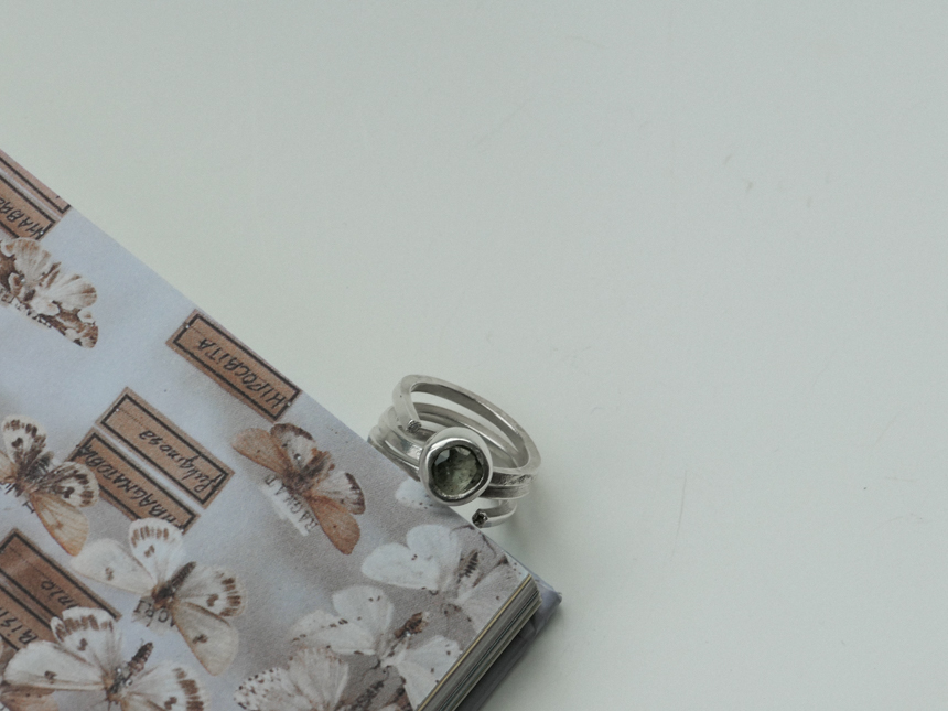 그린수정 원석을 사용해 자연스럽게 은 선을 꼬아 완성된 반지