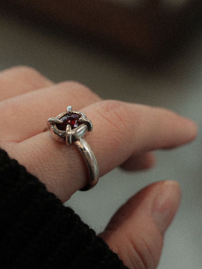 우아하고 고급스러운 컬러의 가넷과 러프한 디테일로 완성된 유니크한 링