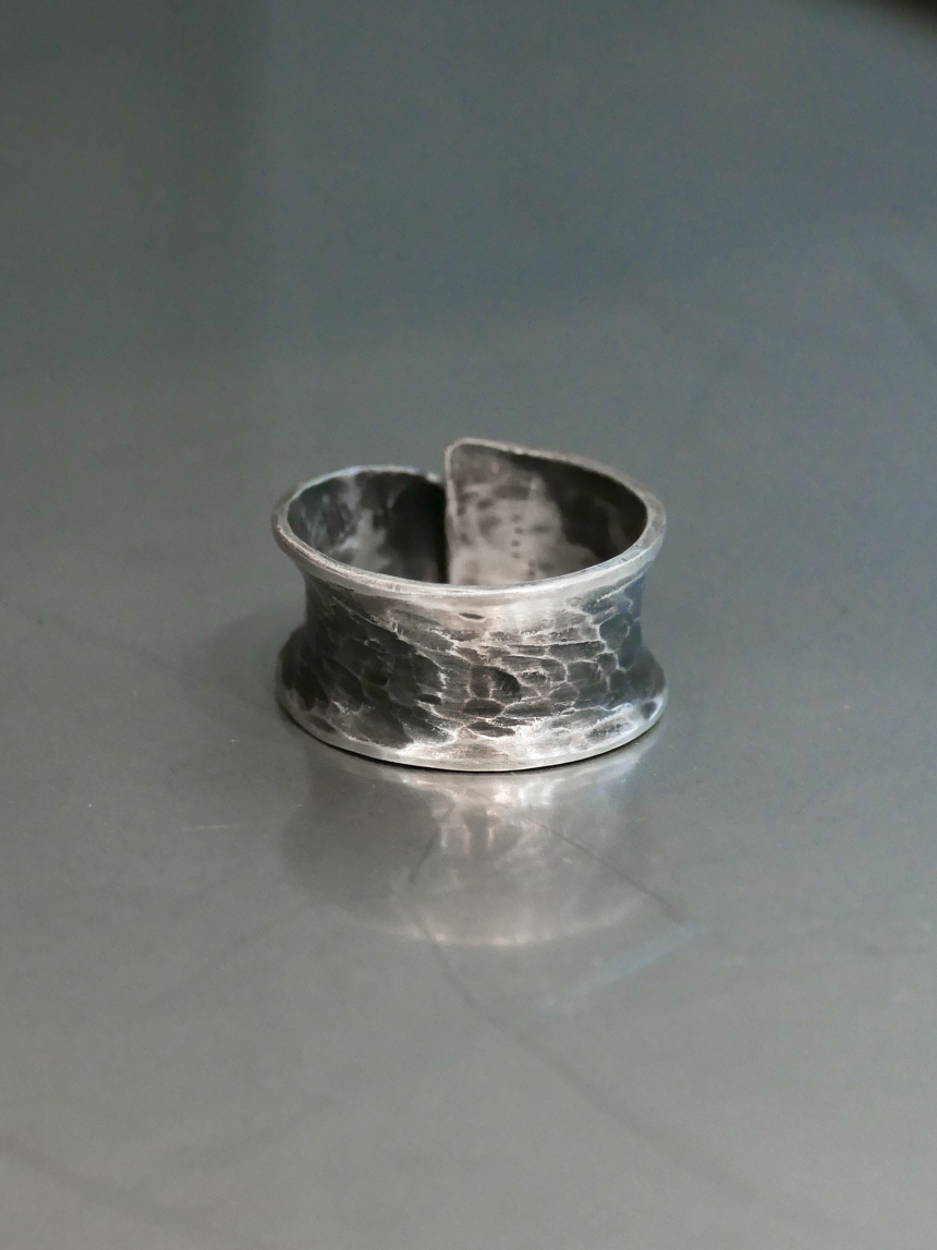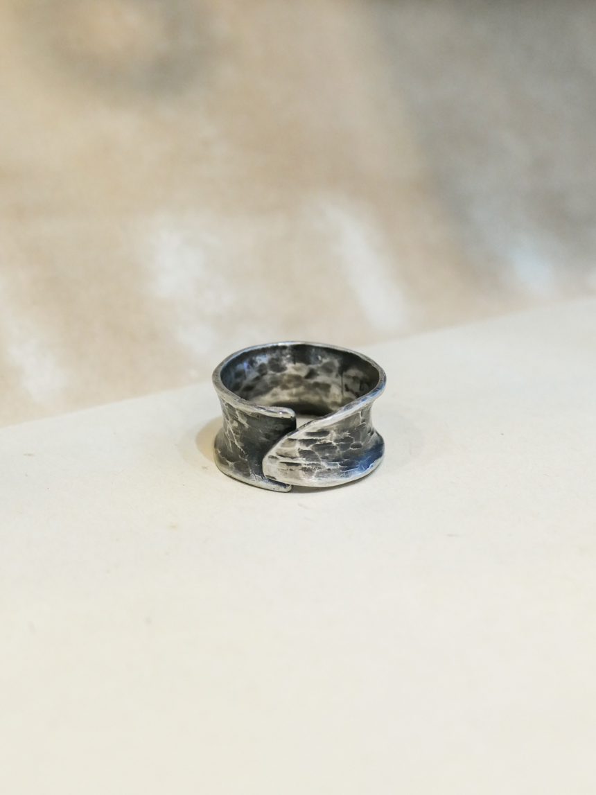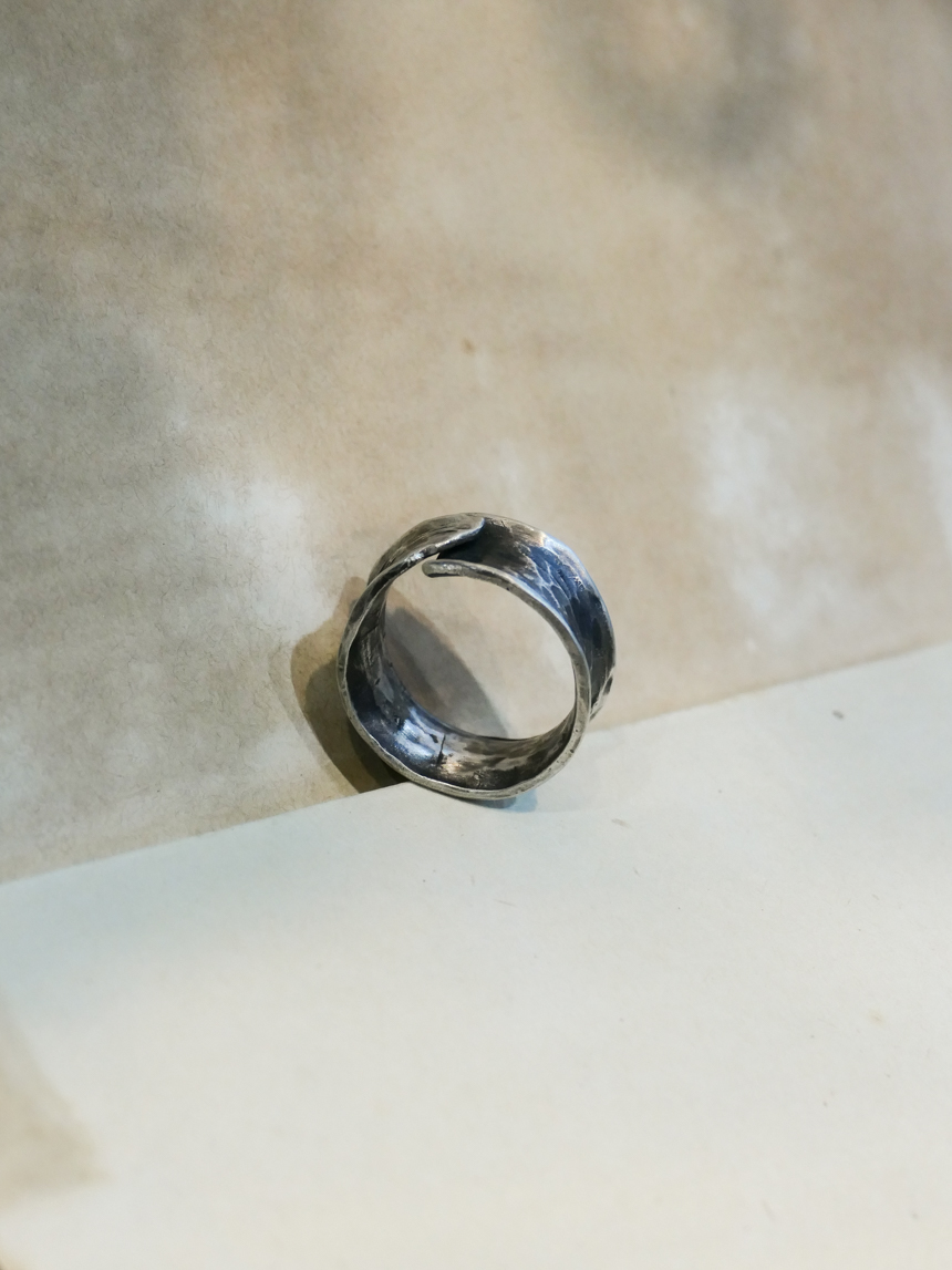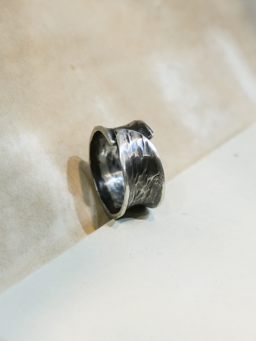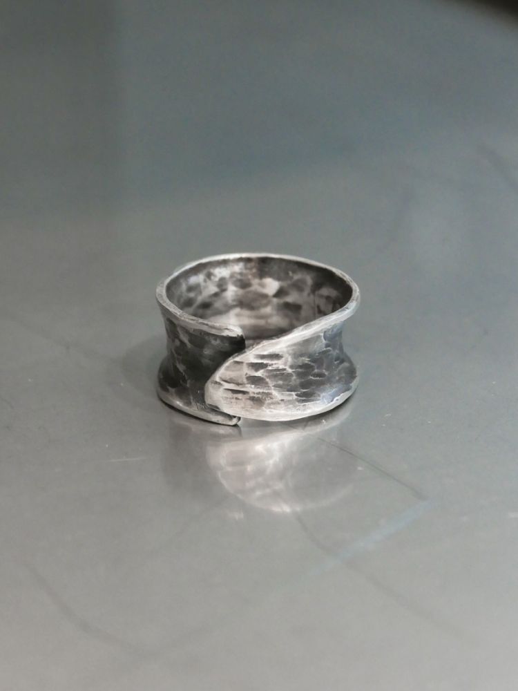 표면을 직접 구부리고, 두드리고, 흠을 내어 완성한 하나의 작품같은 반지 입니다.
