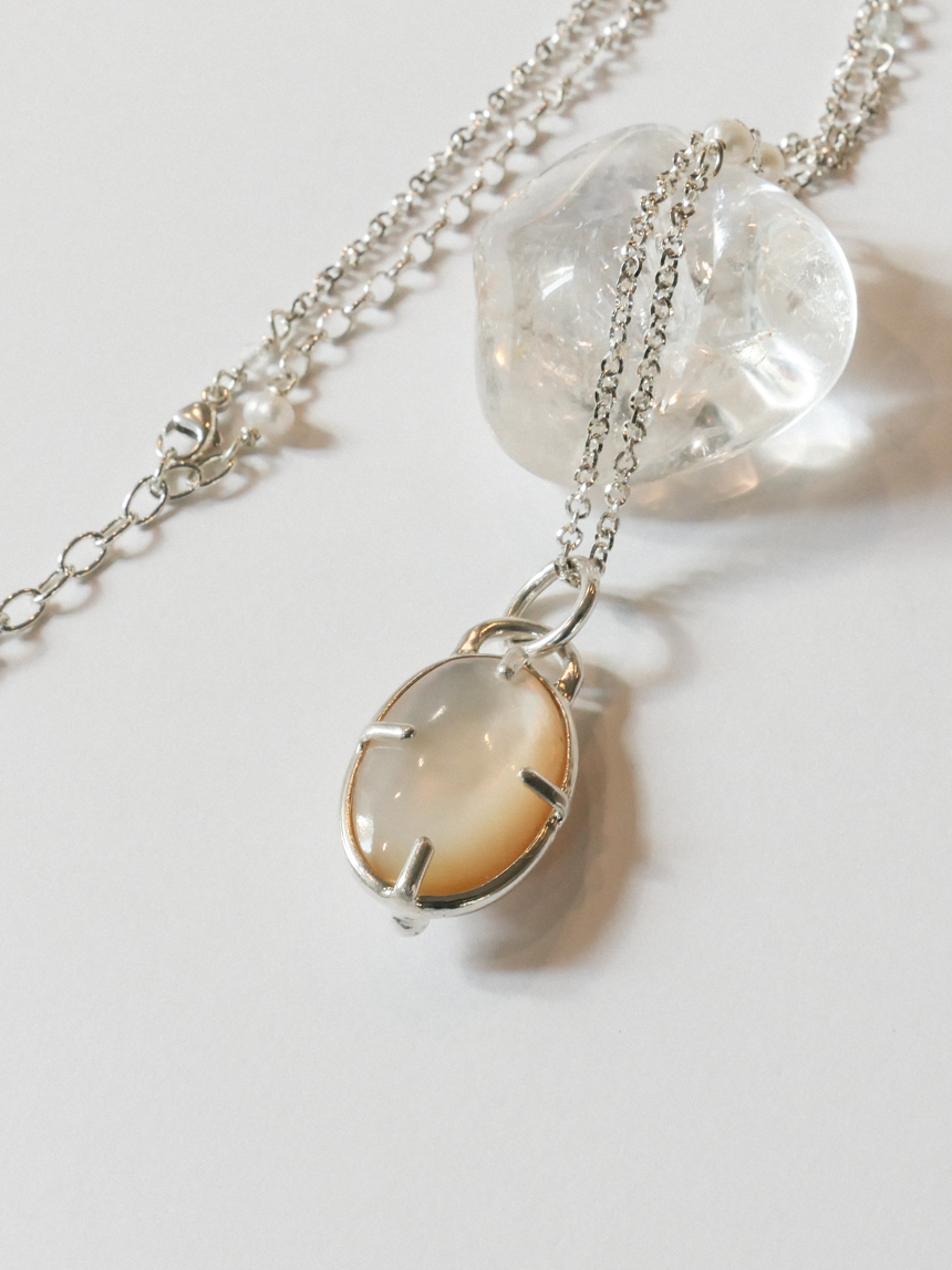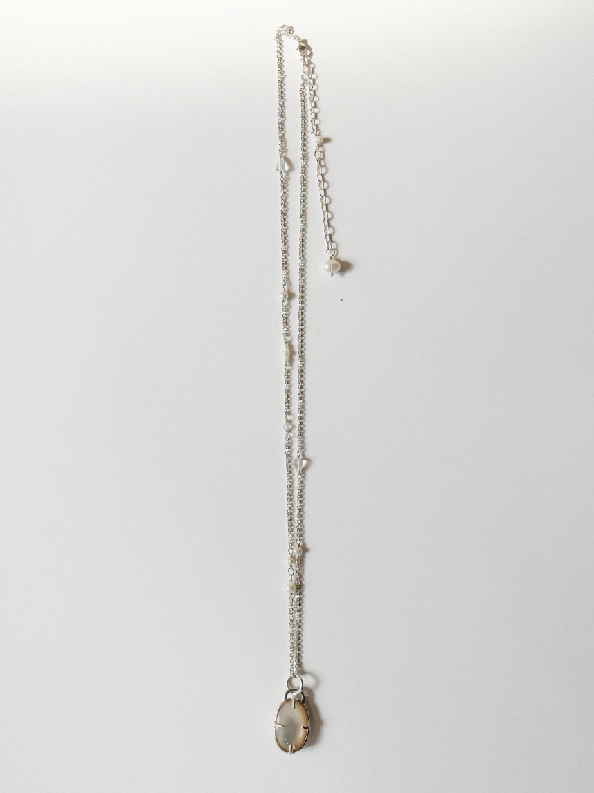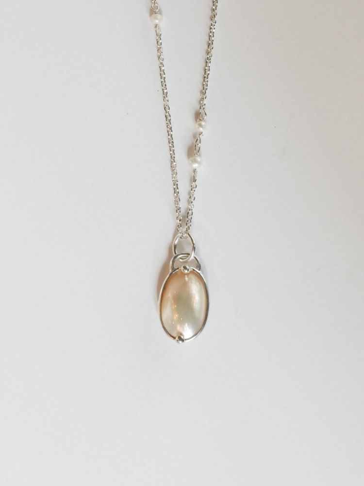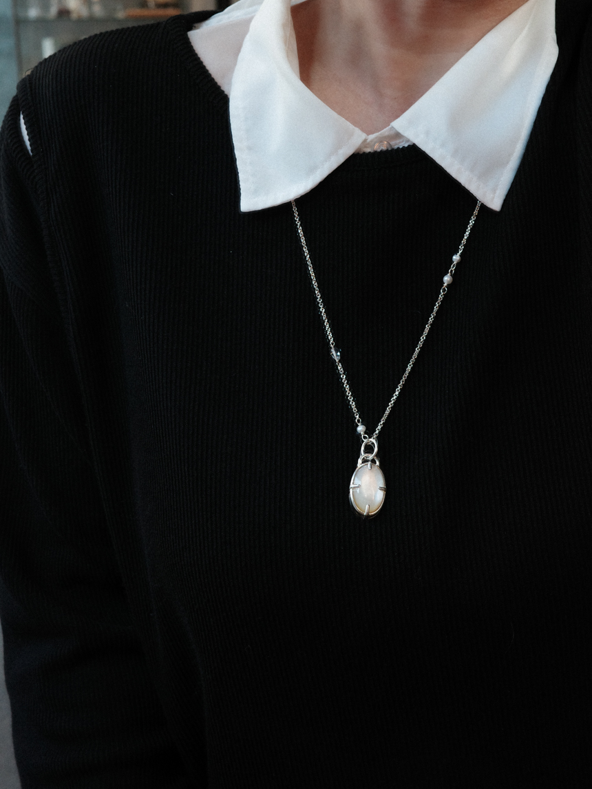 자개 특유의 은은한 광택이 중심 펜던트로 세팅된, 세련된 구성의 실버 목걸이입니다.