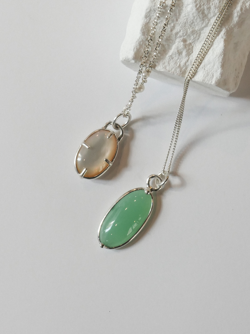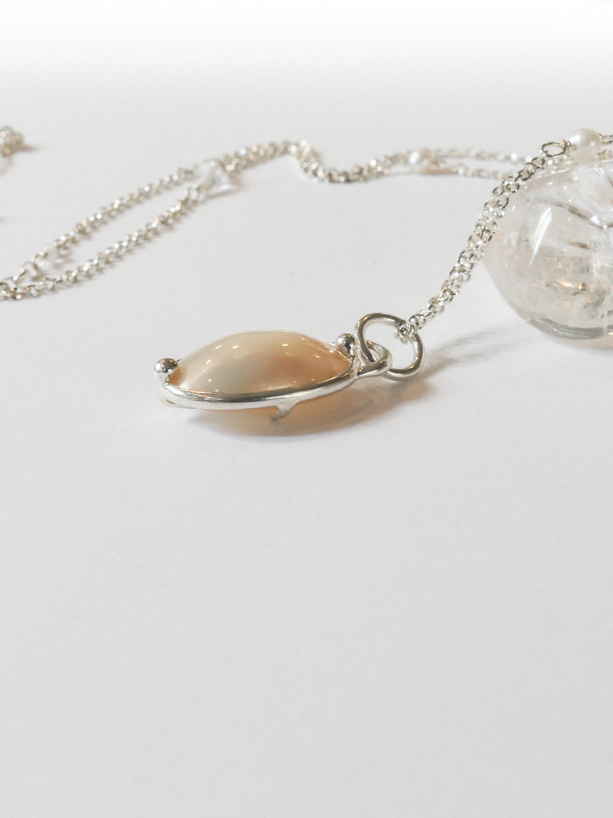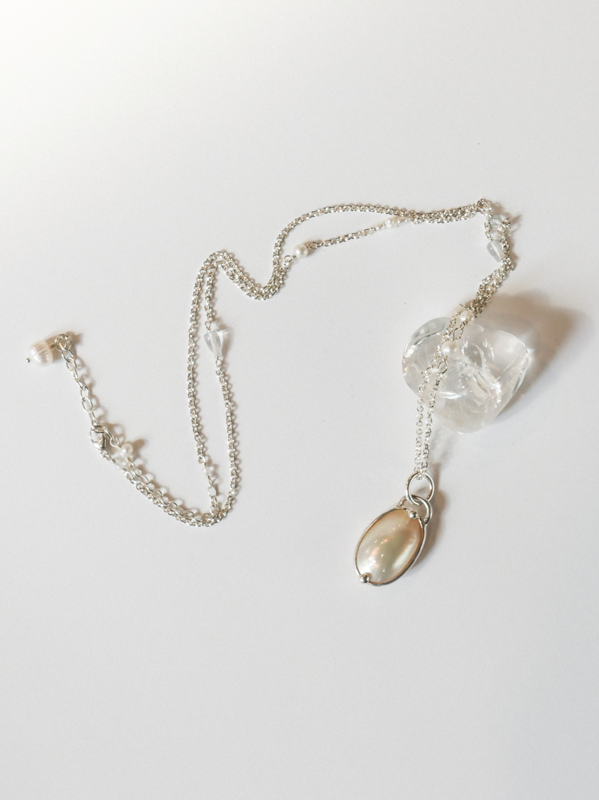 자개 특유의 은은한 광택이 중심 펜던트로 세팅된, 세련된 구성의 실버 목걸이입니다.
