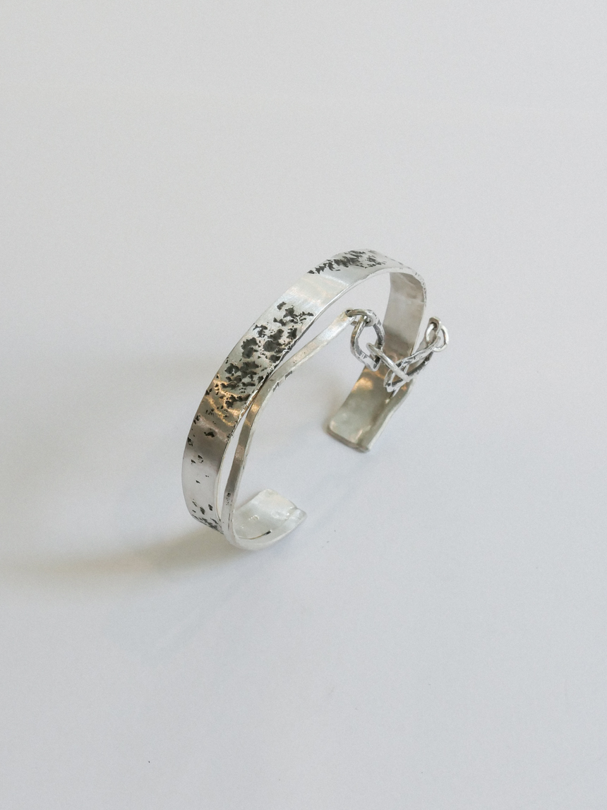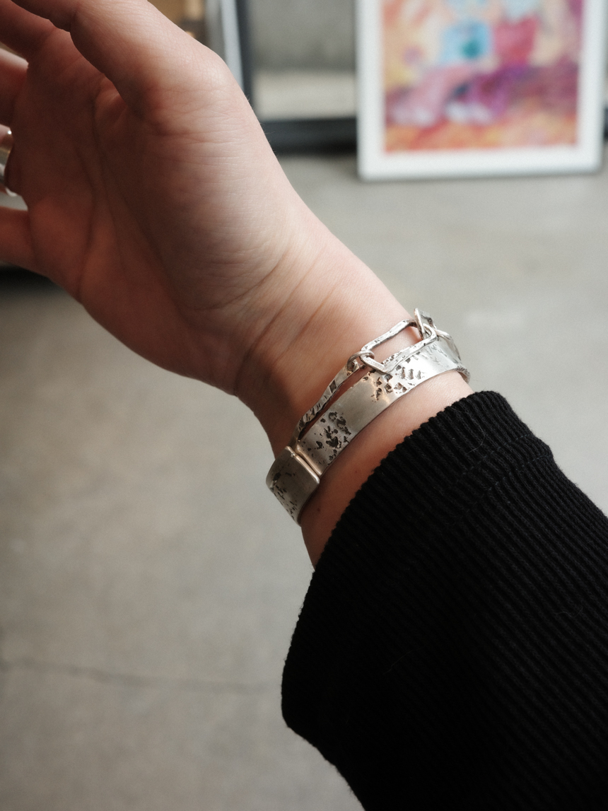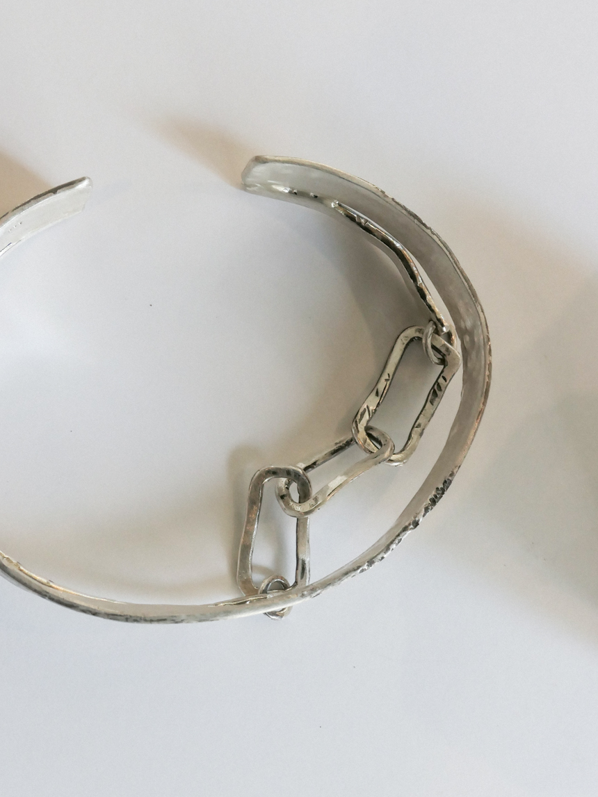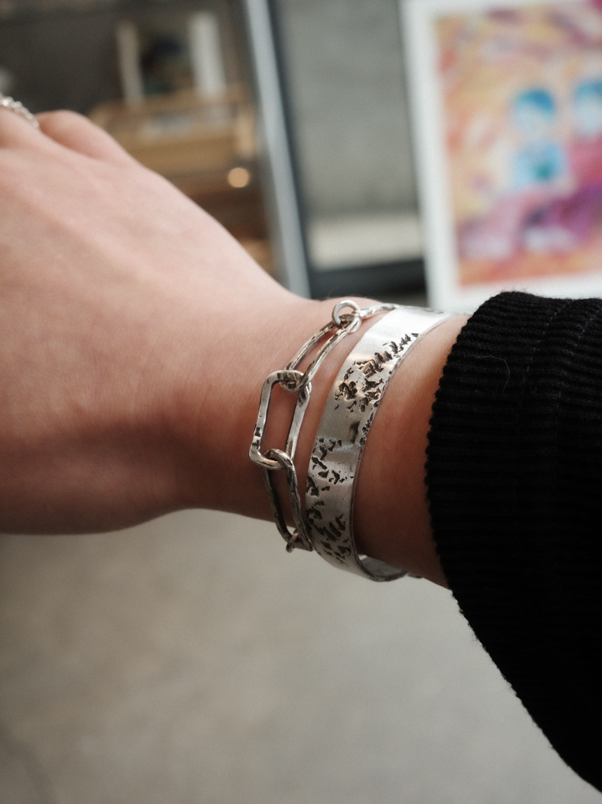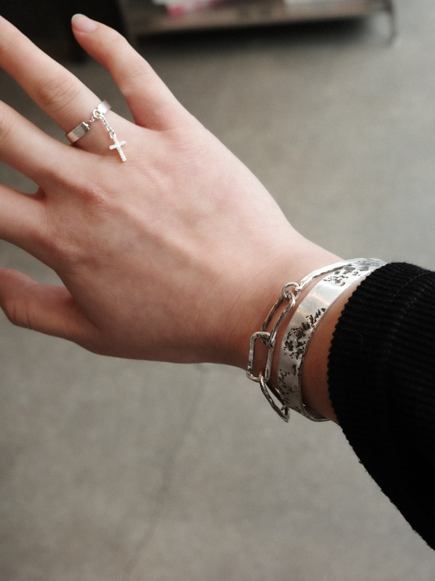 그때그때 돌로 두드려 제작되며 뱅글에 레이어드 느낌으로 달린 체인도 db직접 제작하는 체인으로, 주문시 매 디자인이 같을 수 없고, 비슷한 결로 제작이 됩니다.