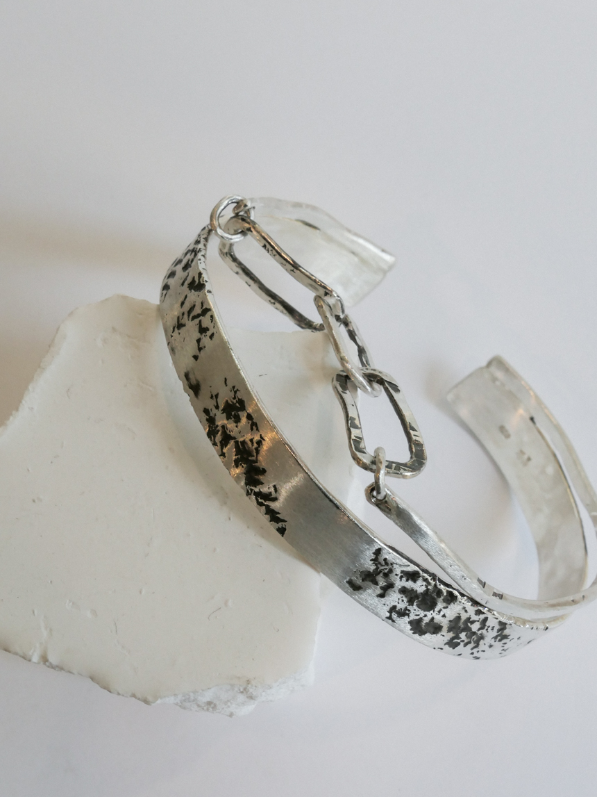 무광 실버 위에 거칠고 불규칙하게 새겨진 텍스처는 금속 위에 돌로 직접 두드려 낸 결과물입니다.