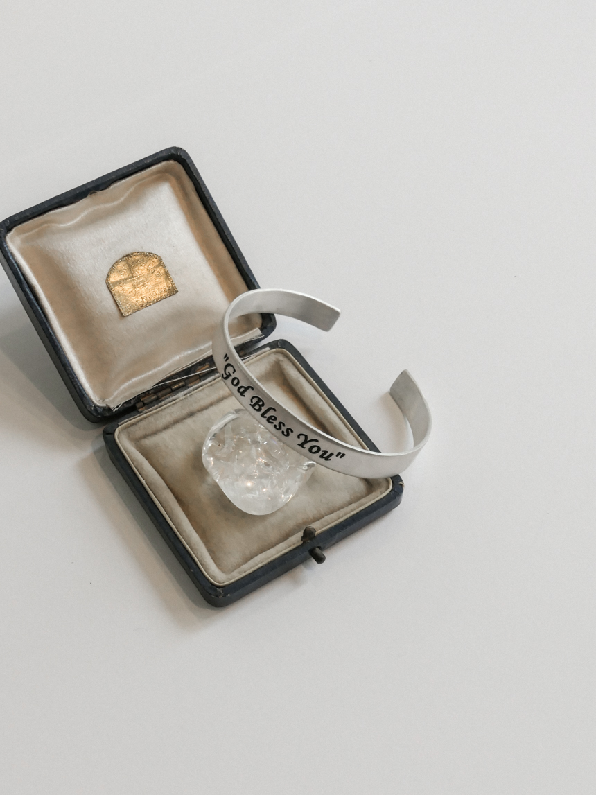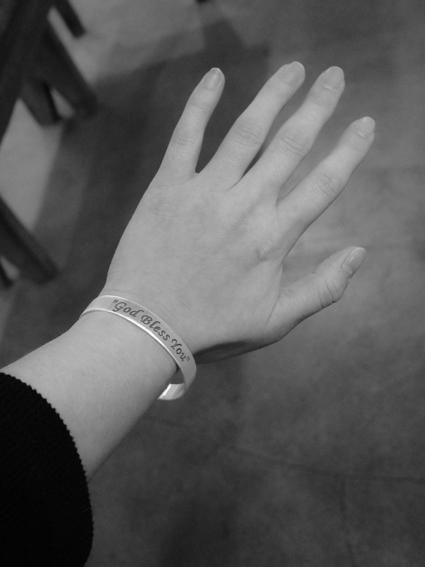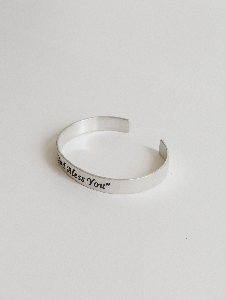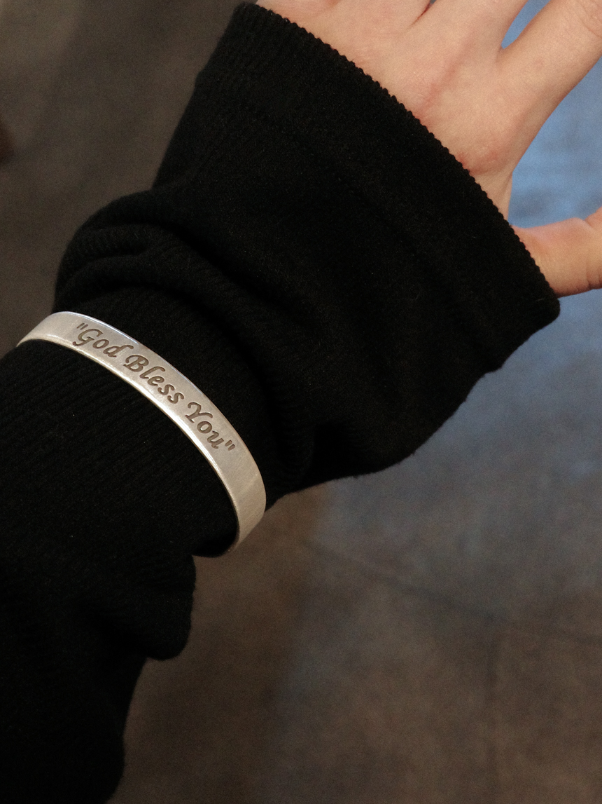 정제된 형태 위에 단 한 줄의 문장이 새겨진, 미니멀 메시지 실버 뱅글입니다.