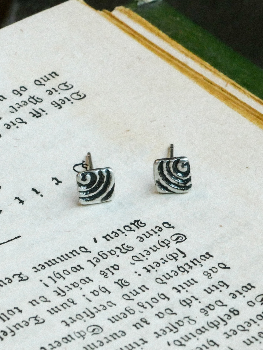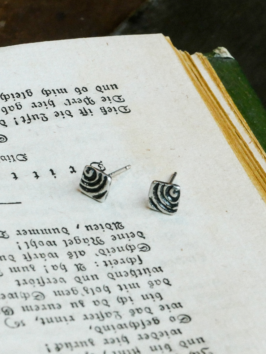 달팽이 껍질의 나선 형태에서 착안한 이 귀걸이는 정사각 구조와 곡선 패턴이 대비를 이룹니다..