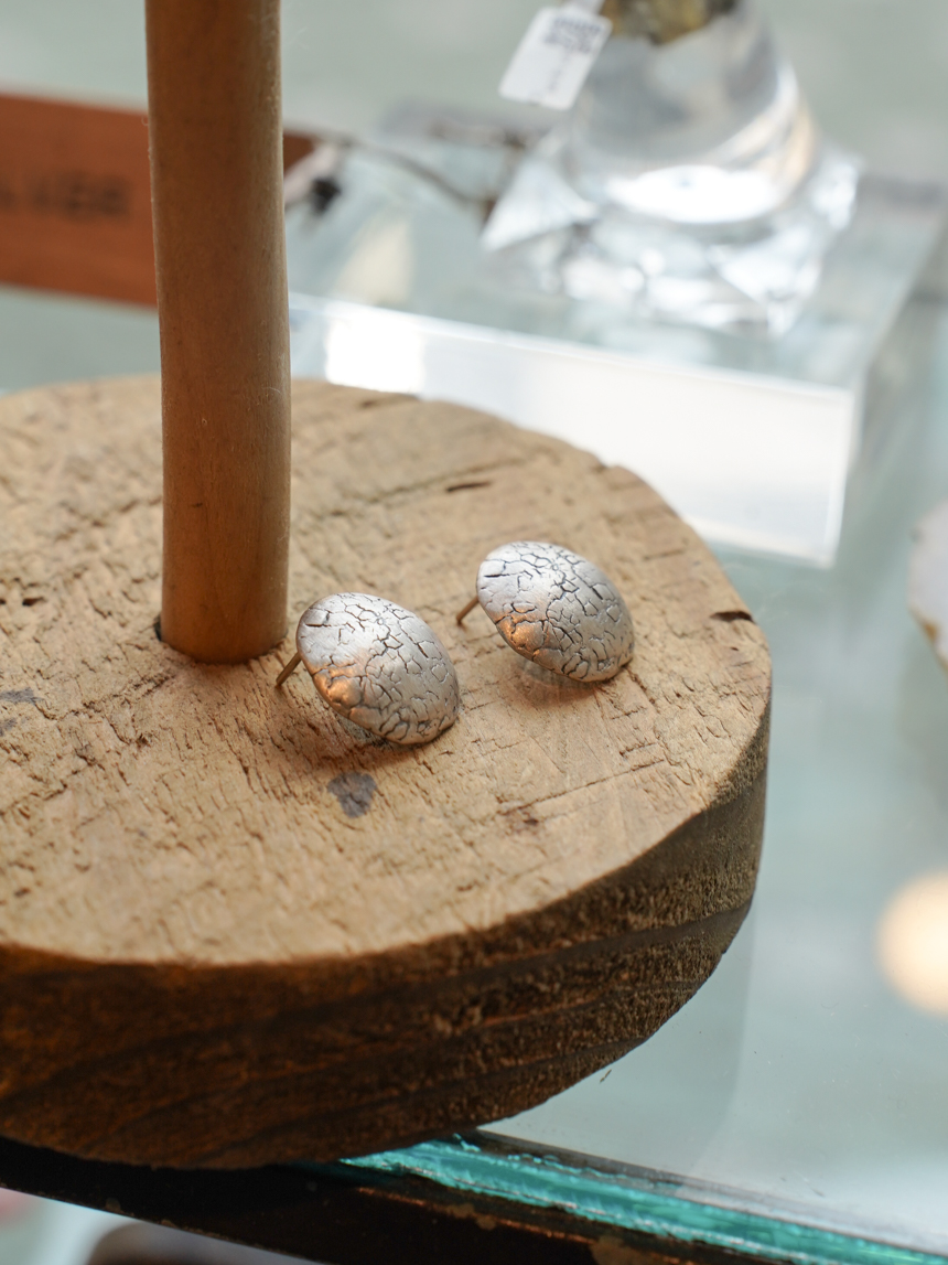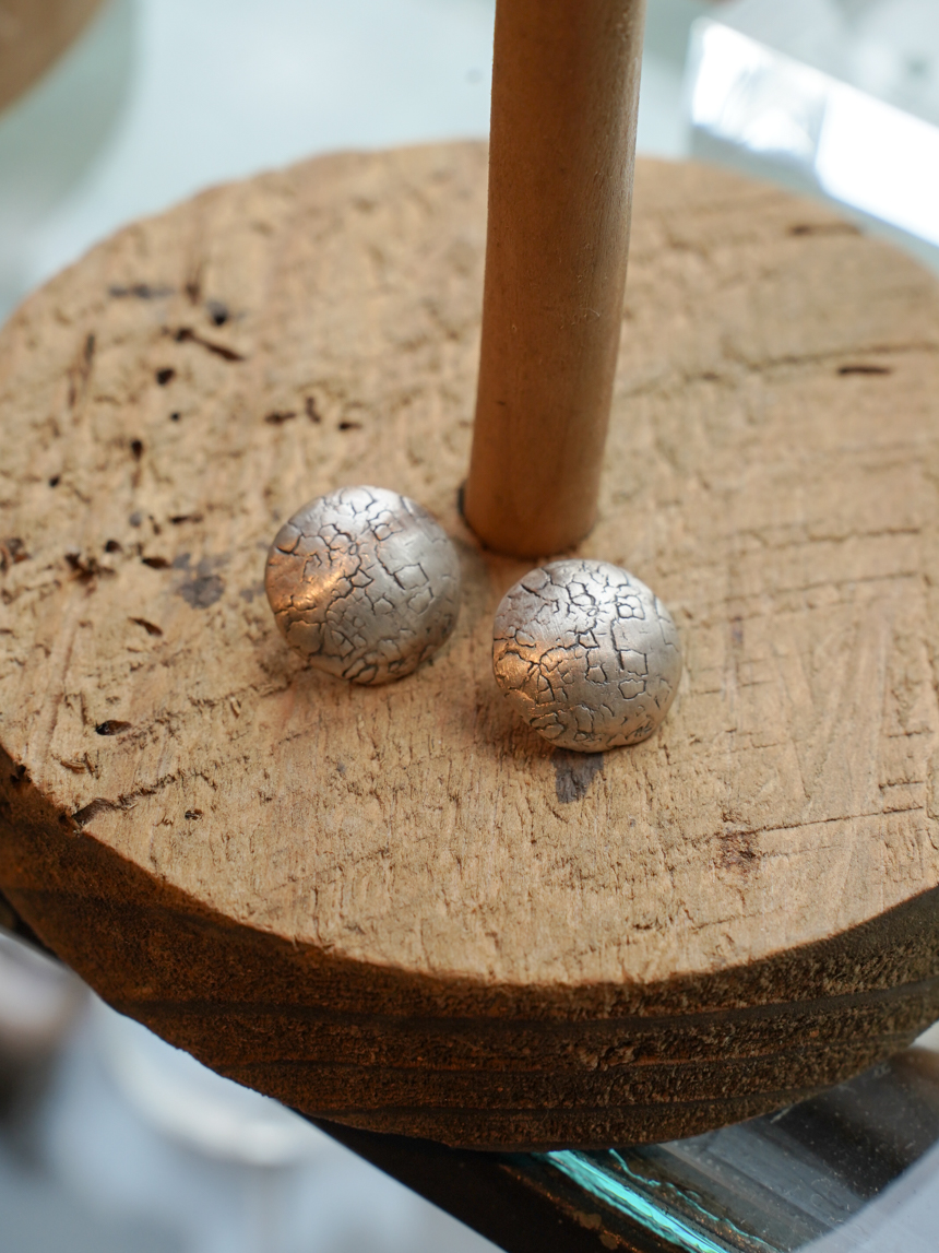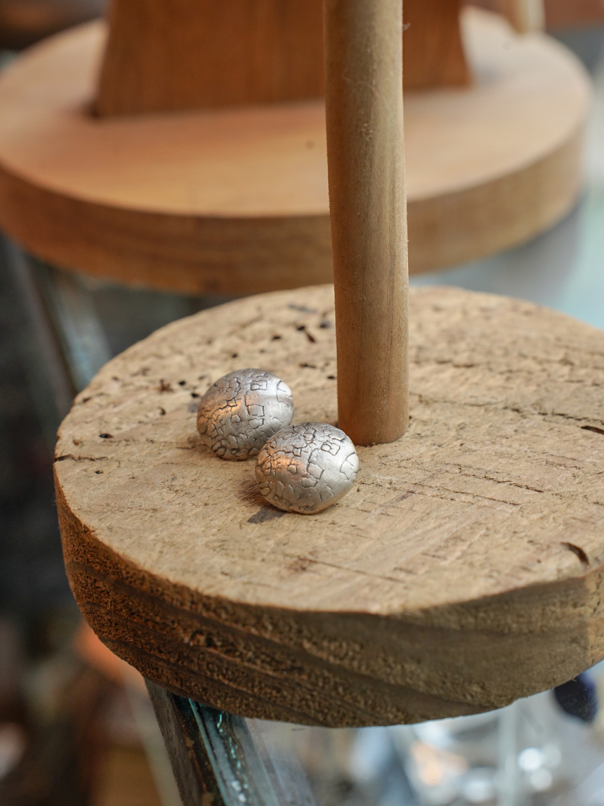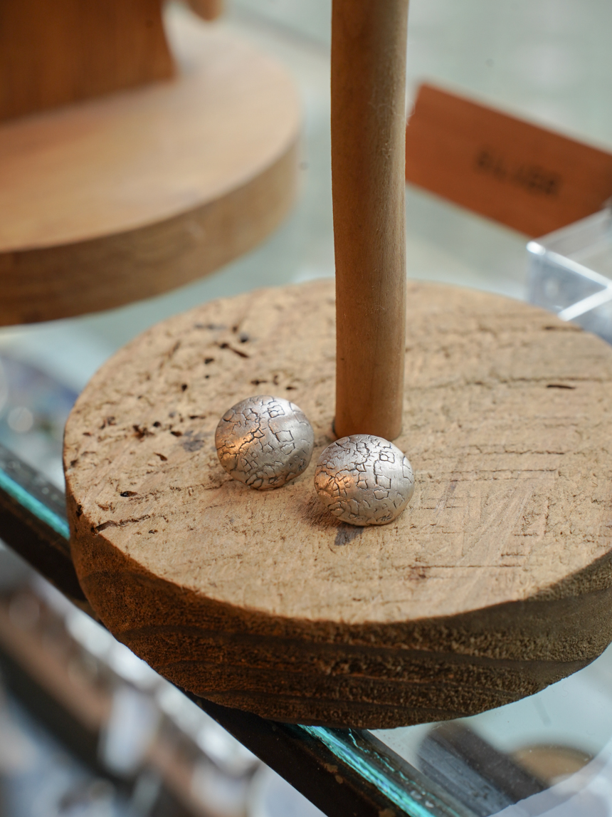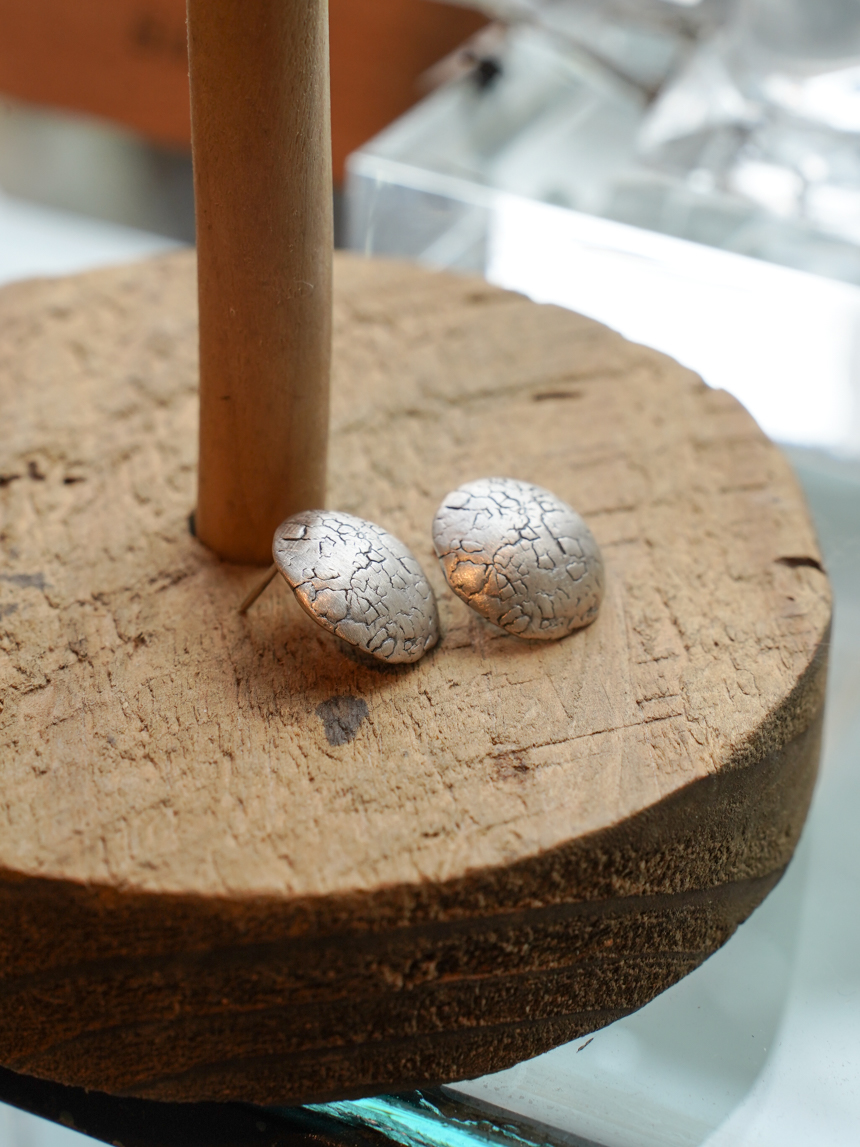 불규칙한 크랙 텍스처를 입힌 돔 형태의 스터드 이어링입니다.