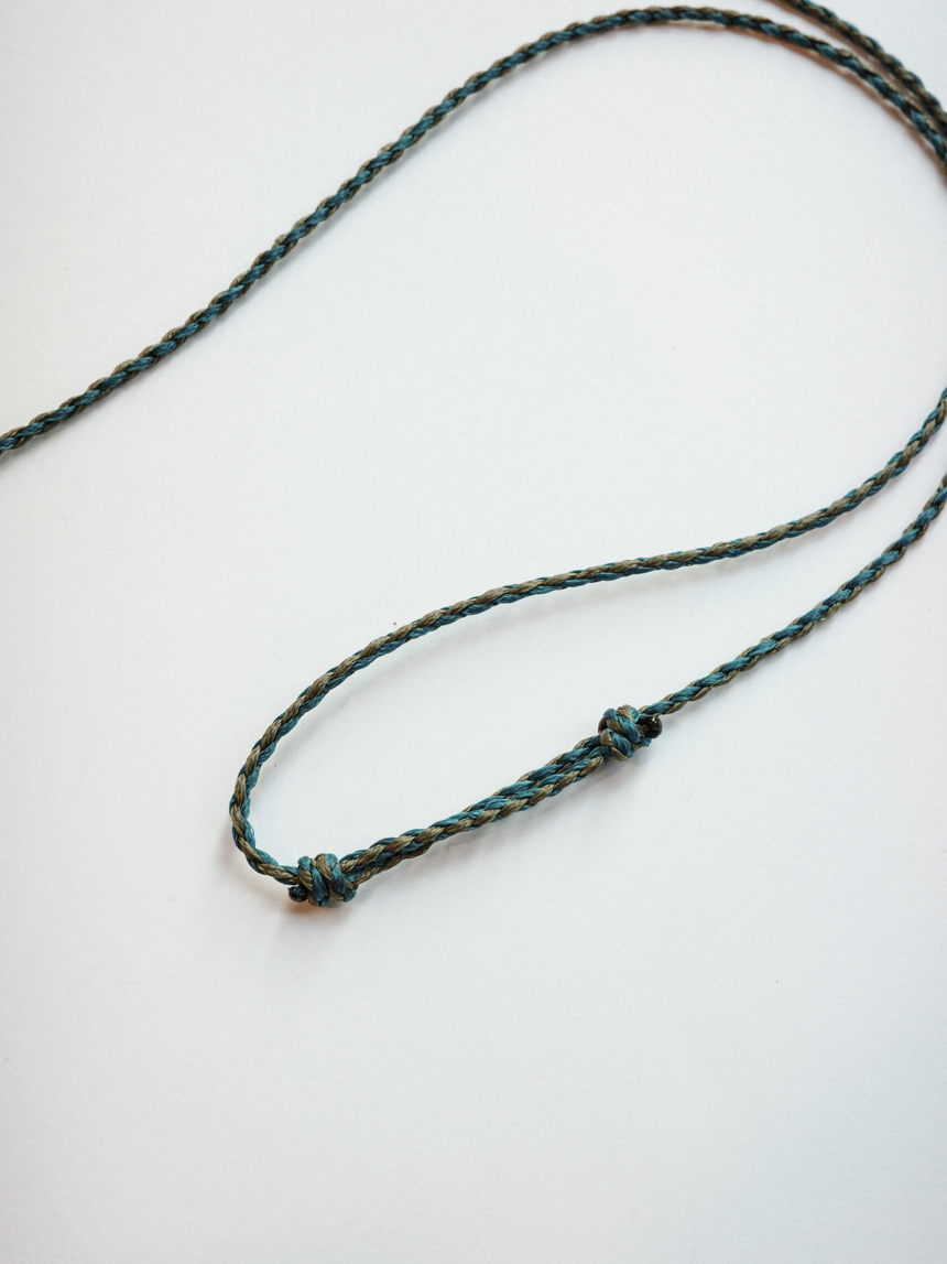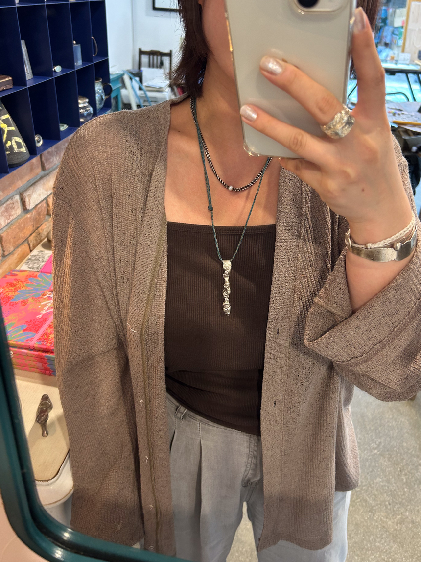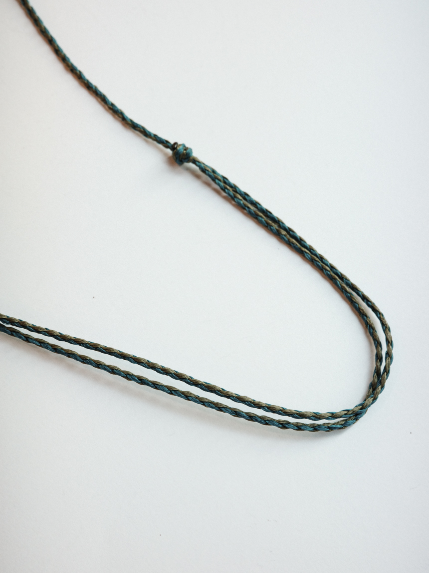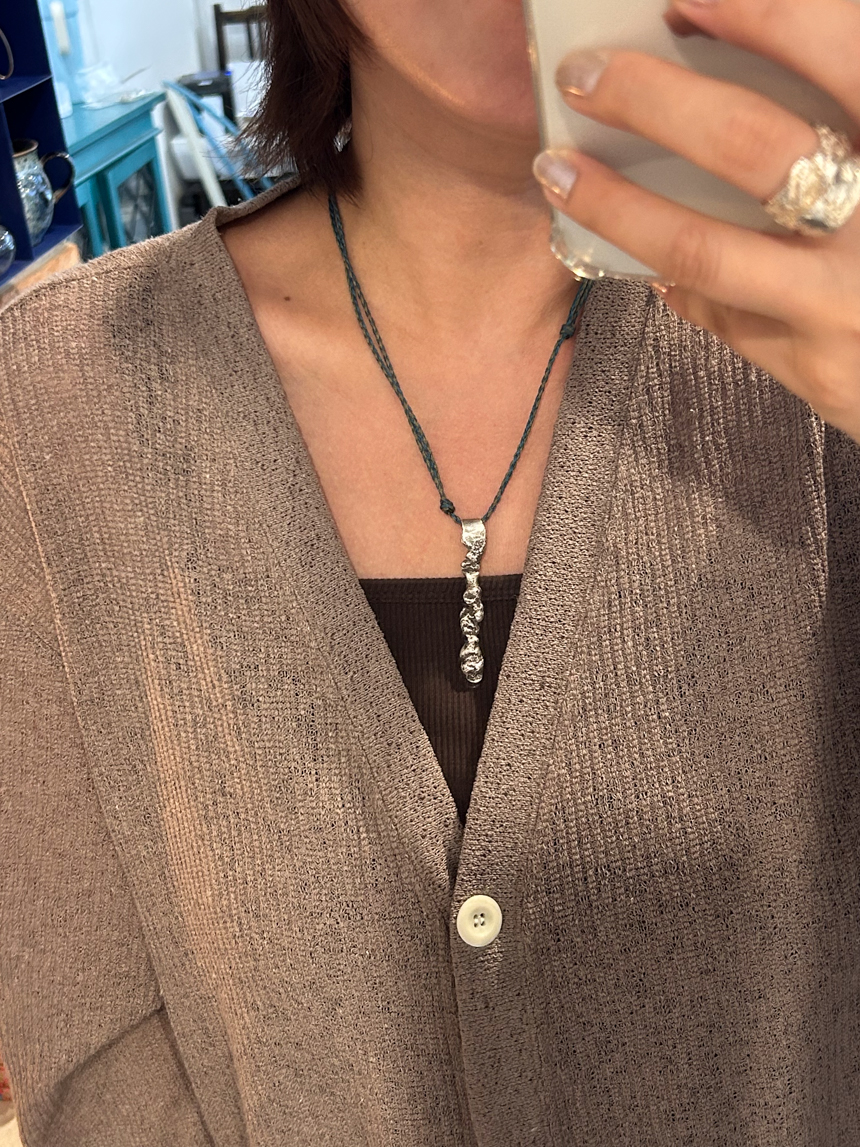 목걸이 줄은 짙은 청록/카키 컬러의 수공 매듭끈을 사용하여, 실버의 차가움과 대조되는 따뜻한 느낌을 더했습니다. 물에 닿아도 되는 실이라 매일 착용하시기 좋아요. 길이 조절이 가능해 자유로운 연출이 가능합니다.