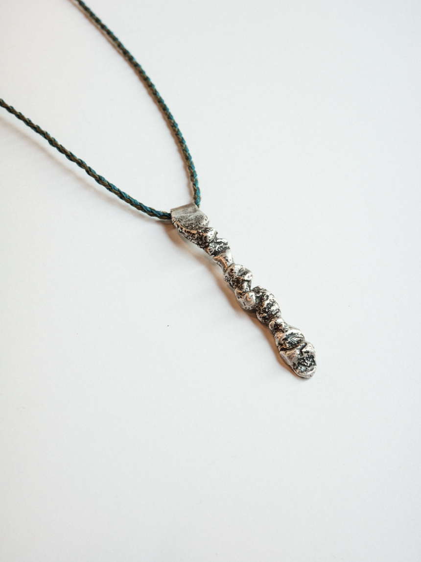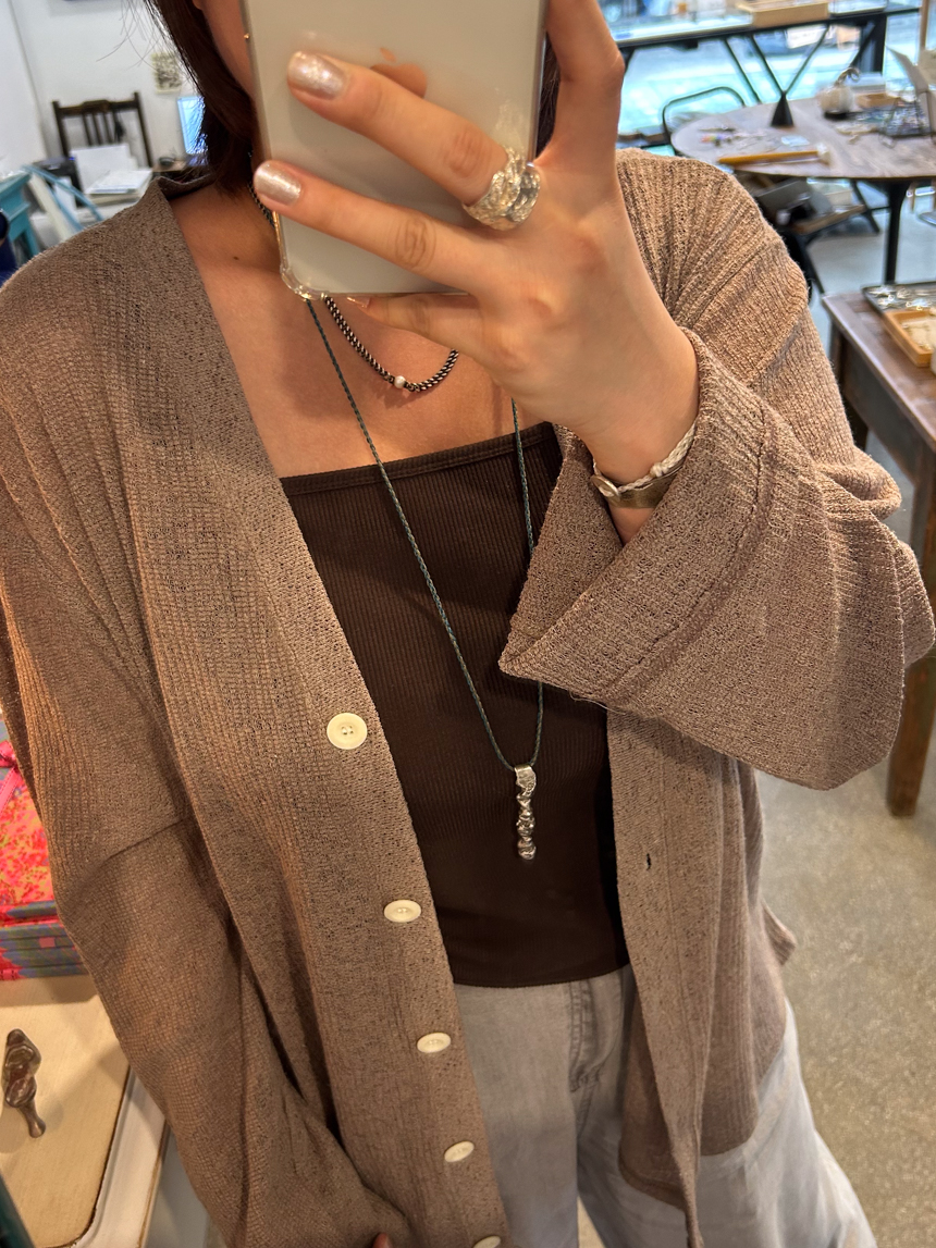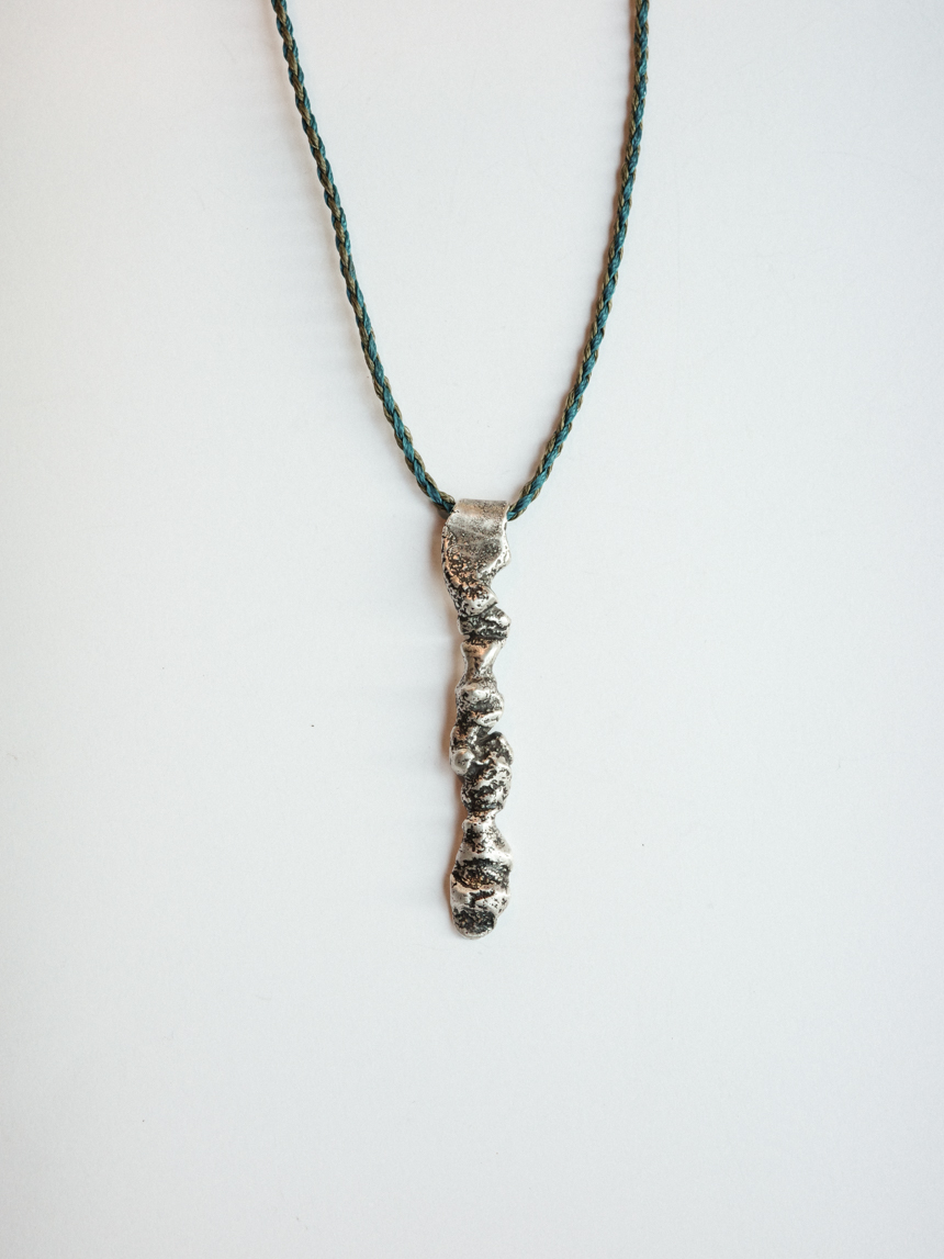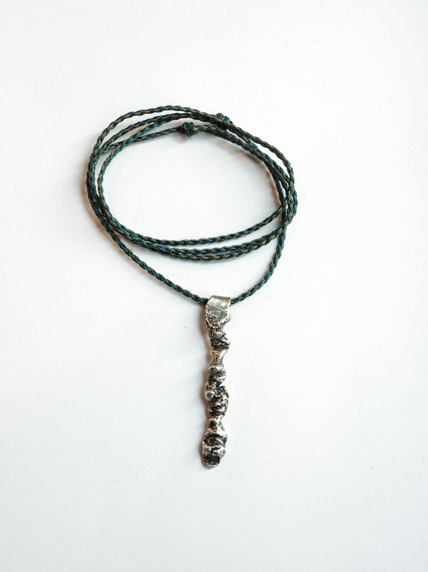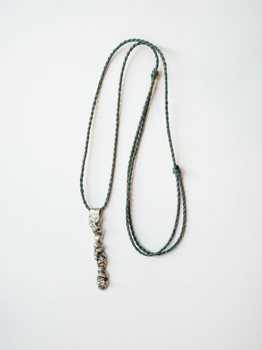 목걸이 줄은 짙은 청록/카키 컬러의 수공 매듭끈을 사용하여, 실버의 차가움과 대조되는 따뜻한 느낌을 더했습니다. 물에 닿아도 되는 실이라 매일 착용하시기 좋아요. 길이 조절이 가능해 자유로운 연출이 가능합니다.