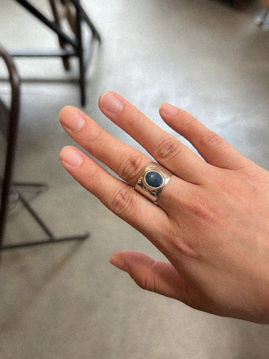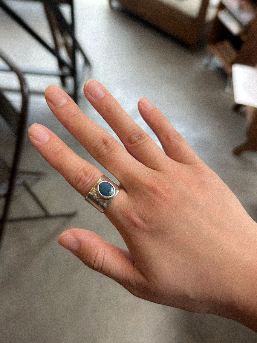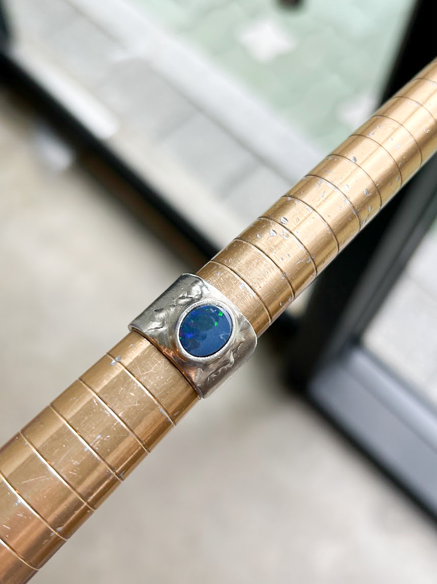 자연스러운 느낌의 무늬가 돋보이는 반지대와 중간에 자리잡고 있는 푸른 오팔