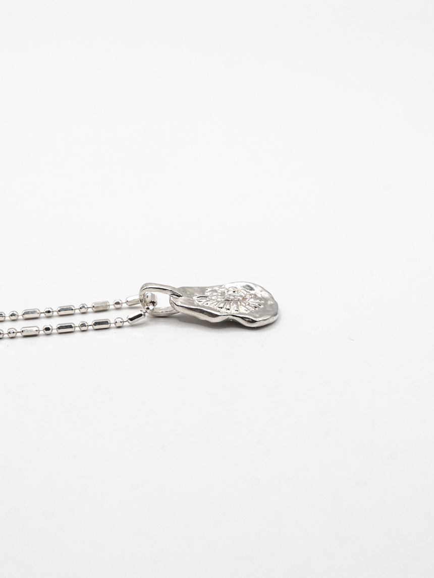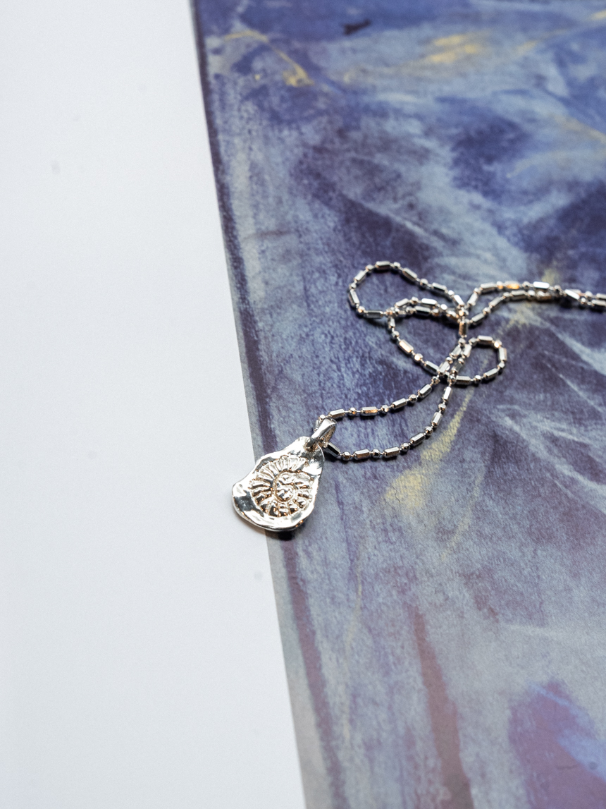 비정형의 울퉁불퉁한 표면의 팬던트. 앞면에는 암모나이트(Ammonite) 무늬, 뒷면에는 작고 러프한 별문양이 새겨져 있습니다.
