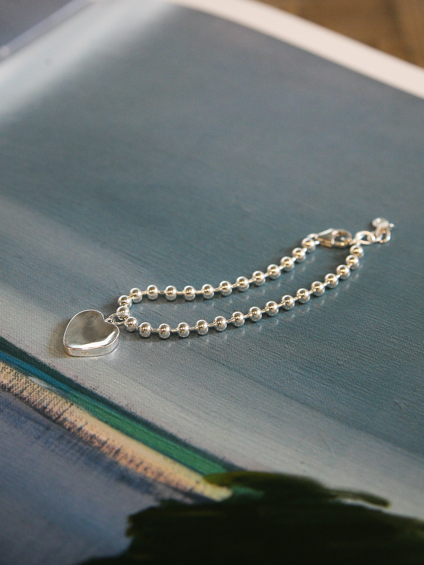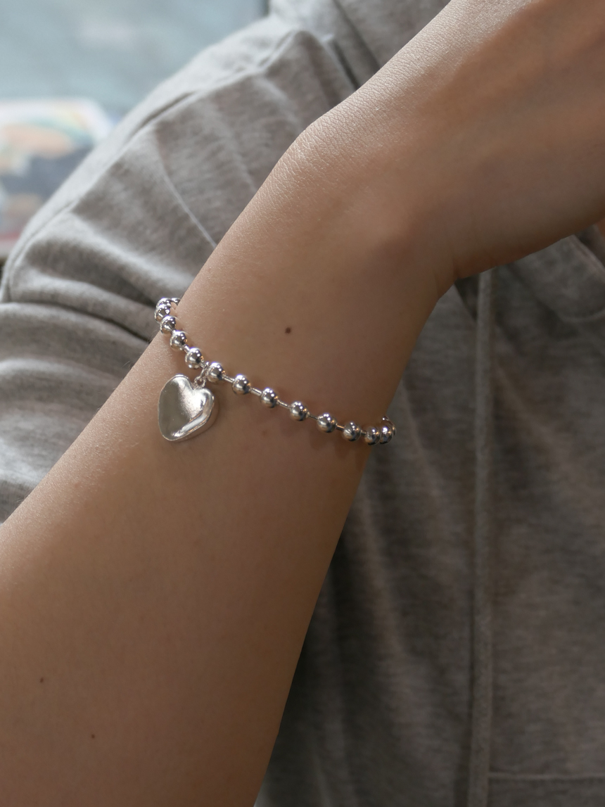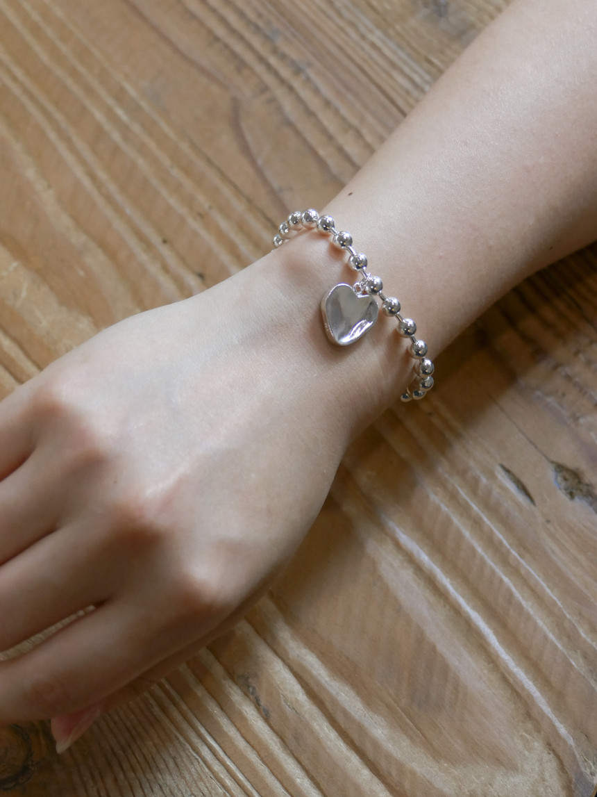 4mm, 5mm의 볼체인과 직접 두드려 만든 입체 하트 참이 시원한 느낌을 주는 팔찌