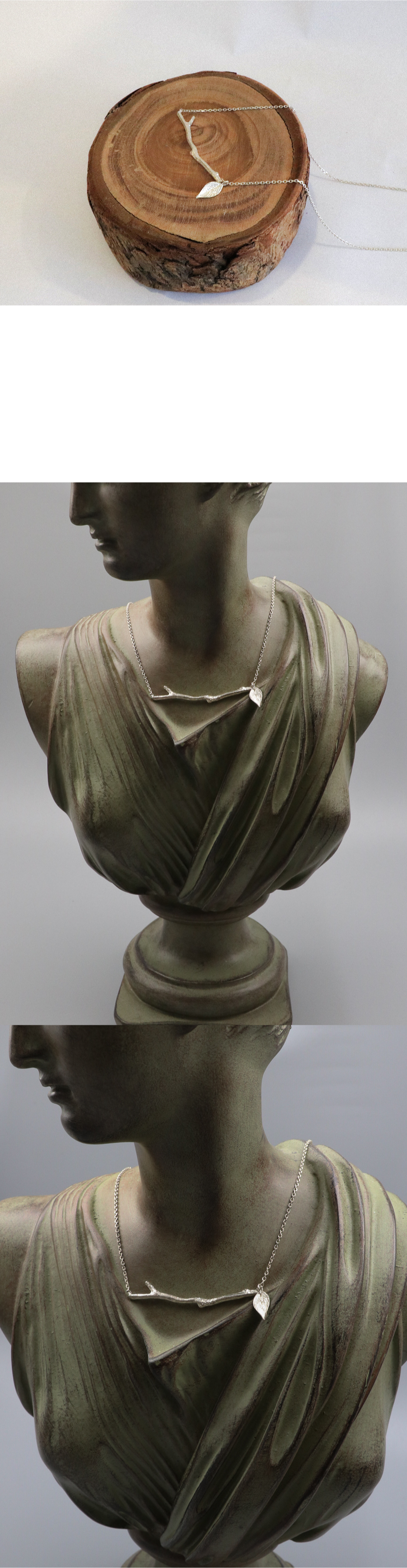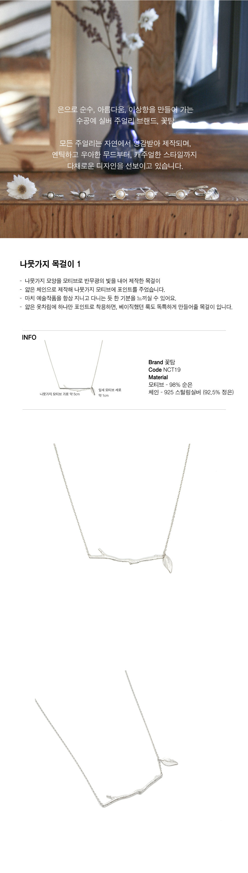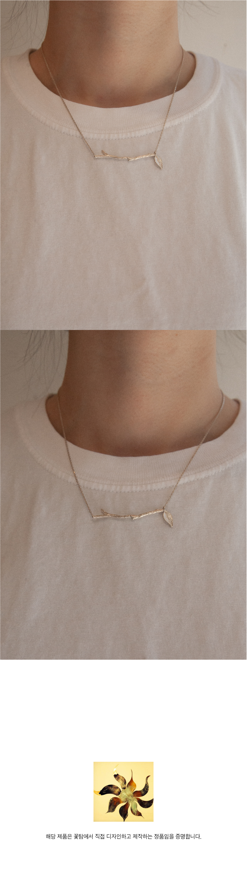 나뭇가지 모양을 모티브로 제작한 목걸이. 얇은 체인으로 제작해 나뭇가지 모티브에 포인트를 주었습니다. 마치 예술작품을 항상 지니고 다니는 듯 한 기분을 느끼실 수 있어요.
