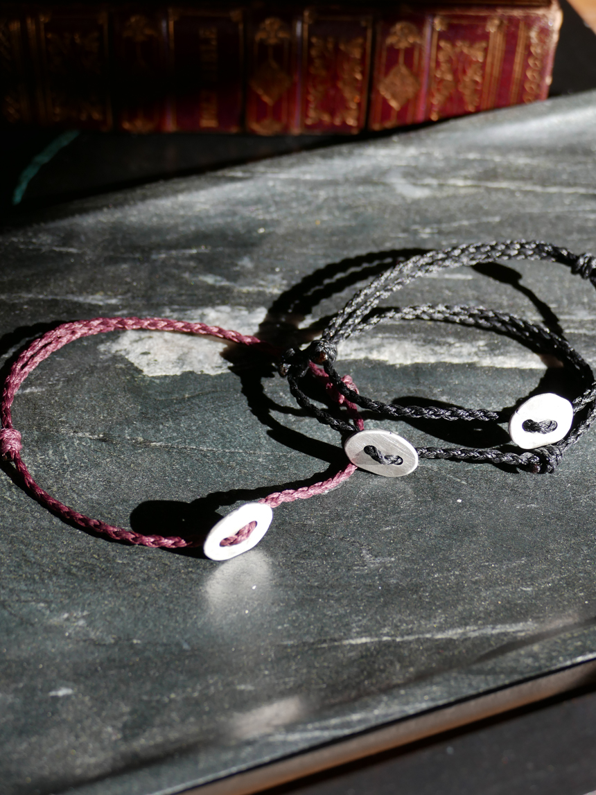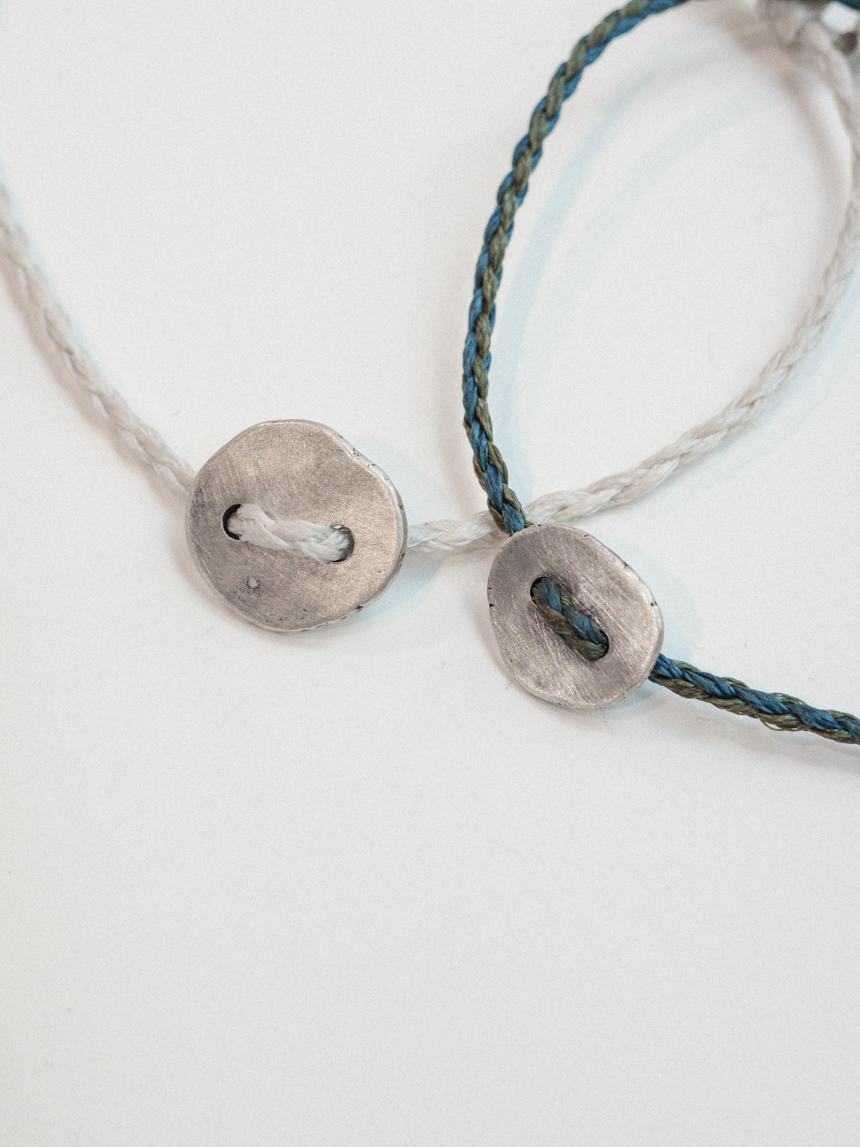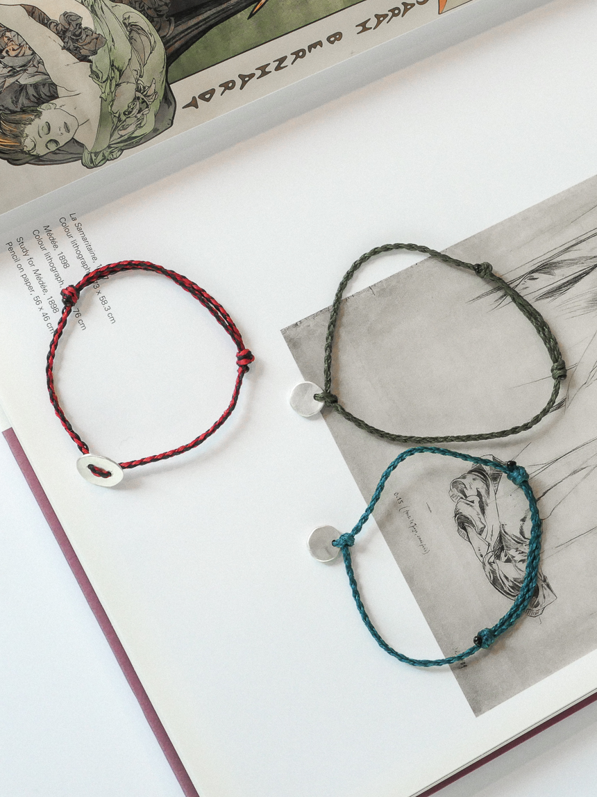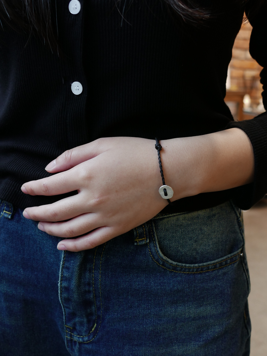 99.9% 핸드메이드 무광 순은 코인이 들어간 매듭팔찌. 양쪽 매듭을 이용하여 사이즈를 유동적으로 조절할수 있습니다.