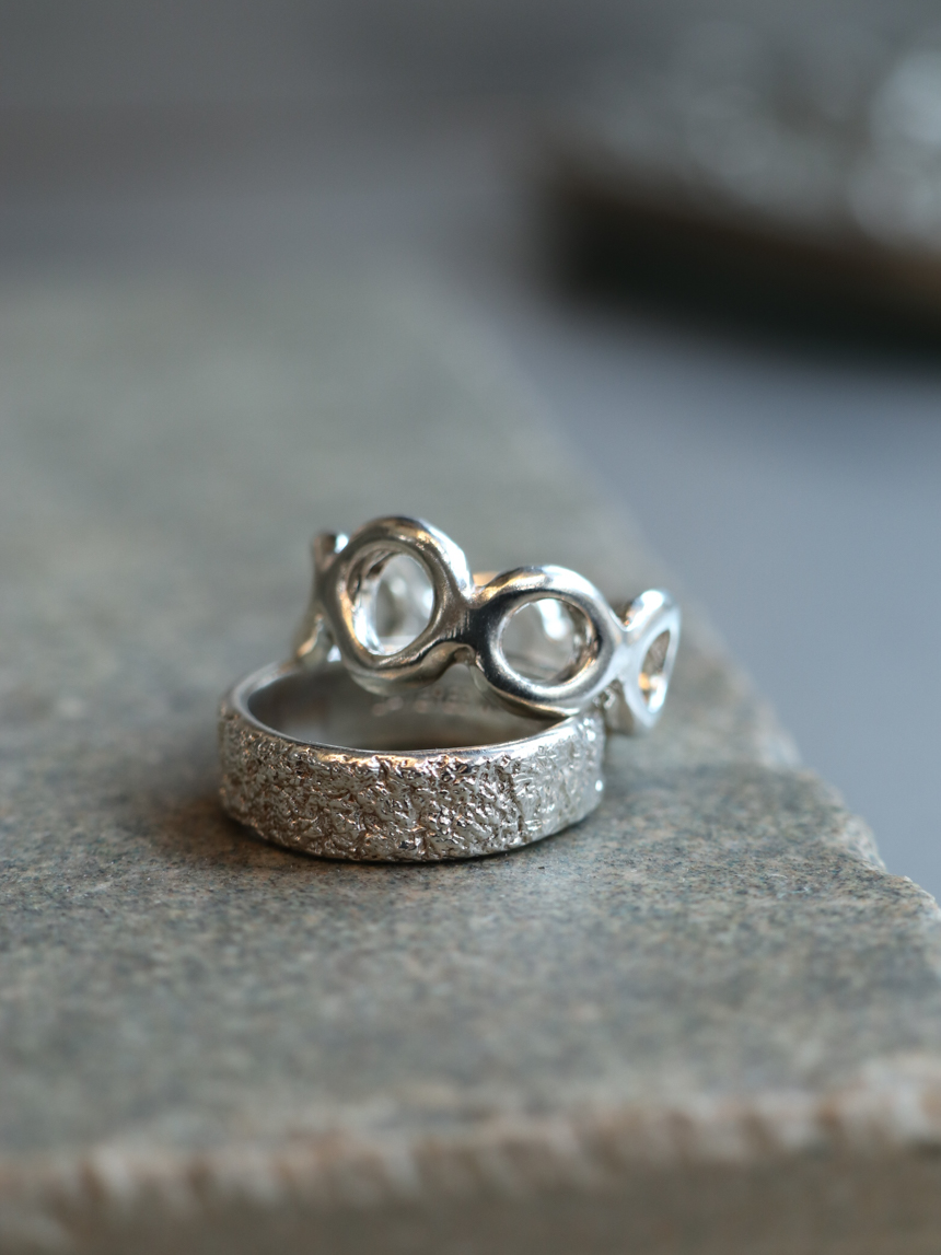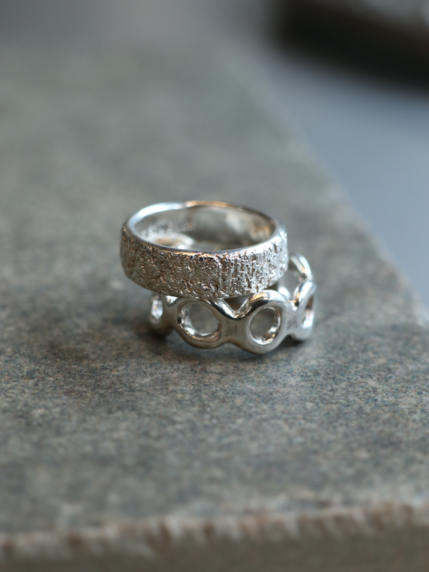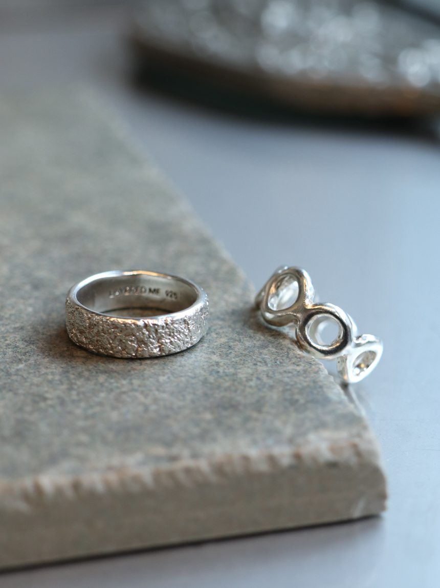 은의 단면에 돌의 표면을 닮은듯한 독특한 질감을 표현하여 포인트를 준 반지