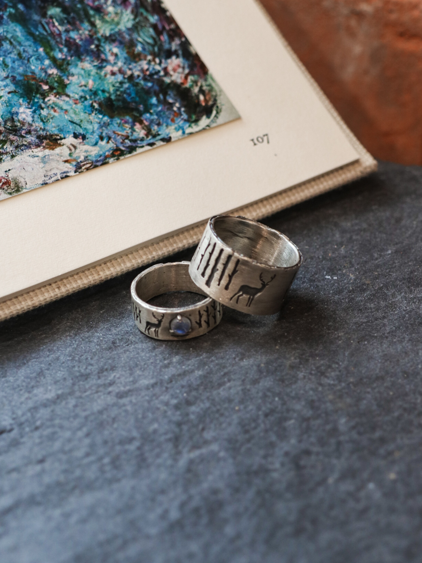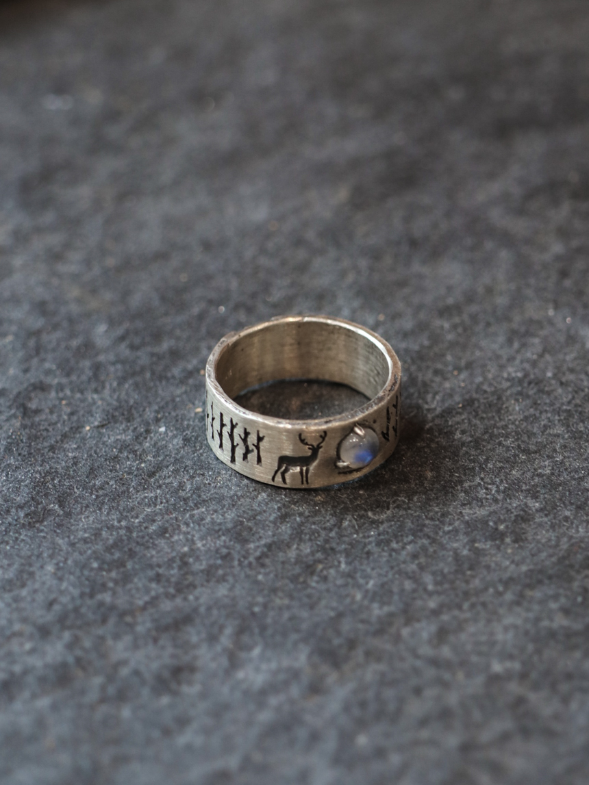 사슴이 뛰어다니는 숲을 문스톤과 함께 디자인한 동화같은 반지 입니다.