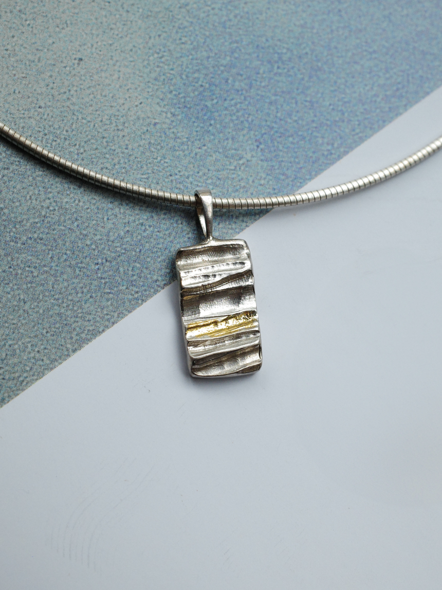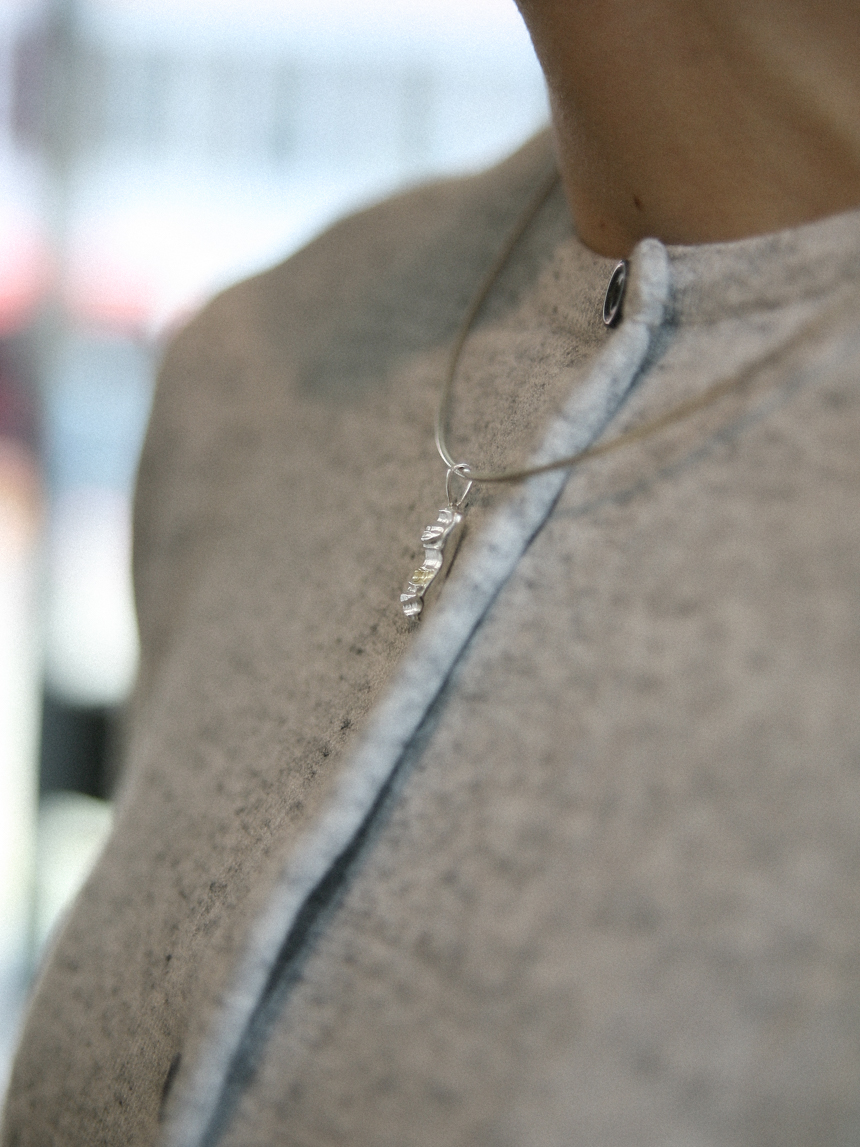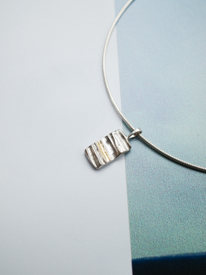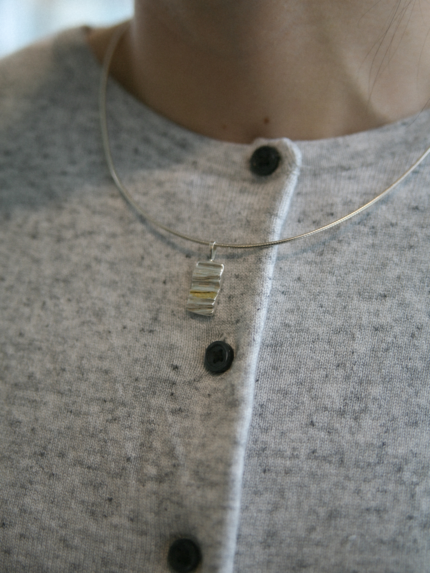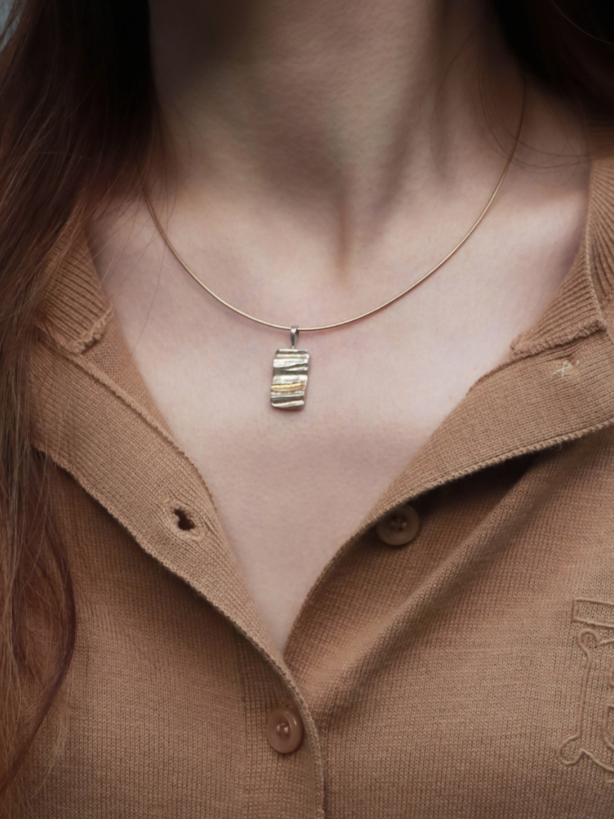 투박한 질감을 살려 높이차를 두어 제작한 스퀘어모양의 팬던트와 대비적으로 심플한 줄을 함께 매치시켜 디자인 하였습니다.