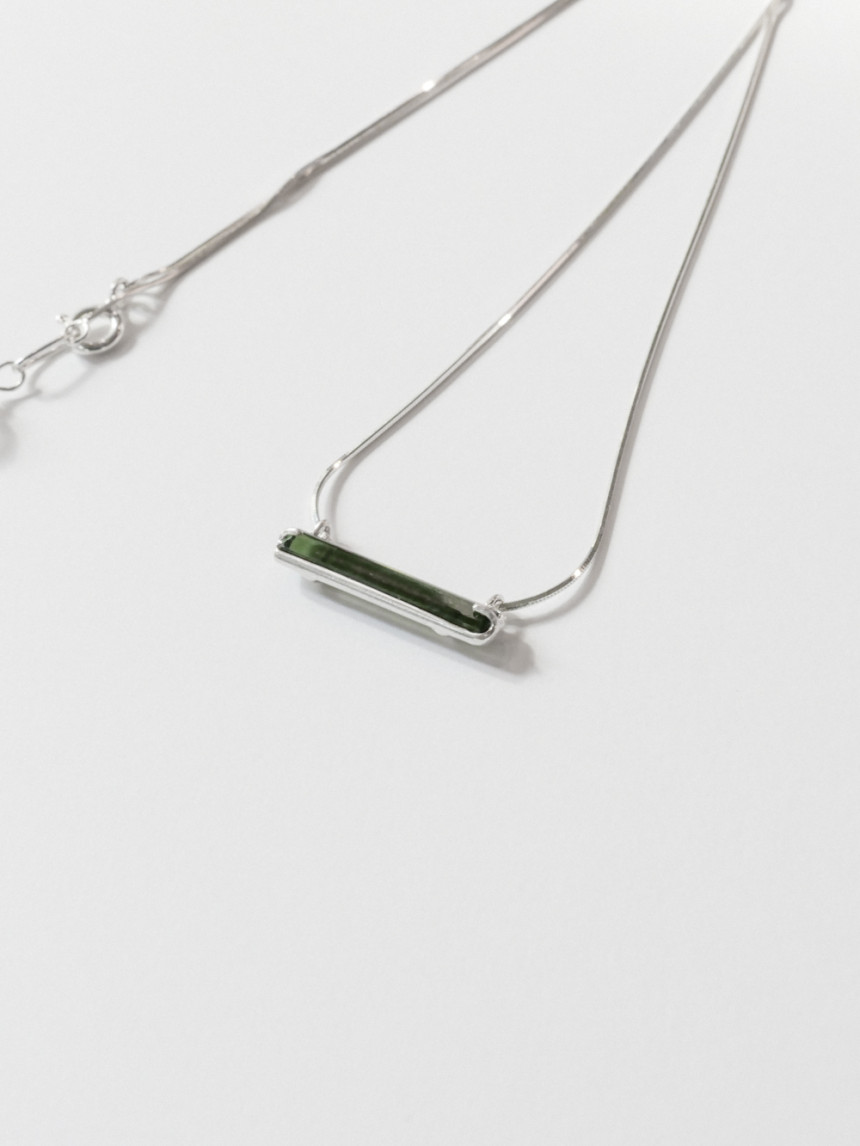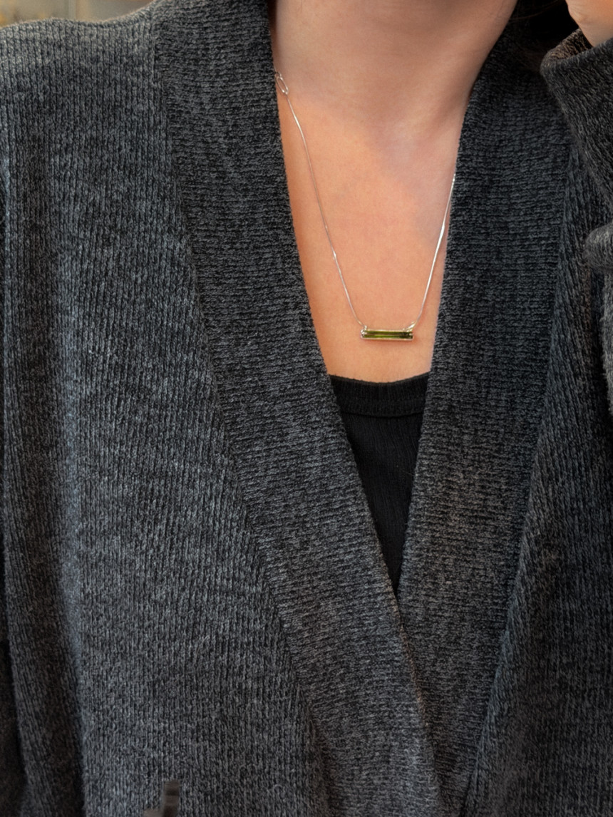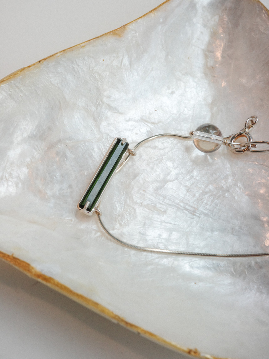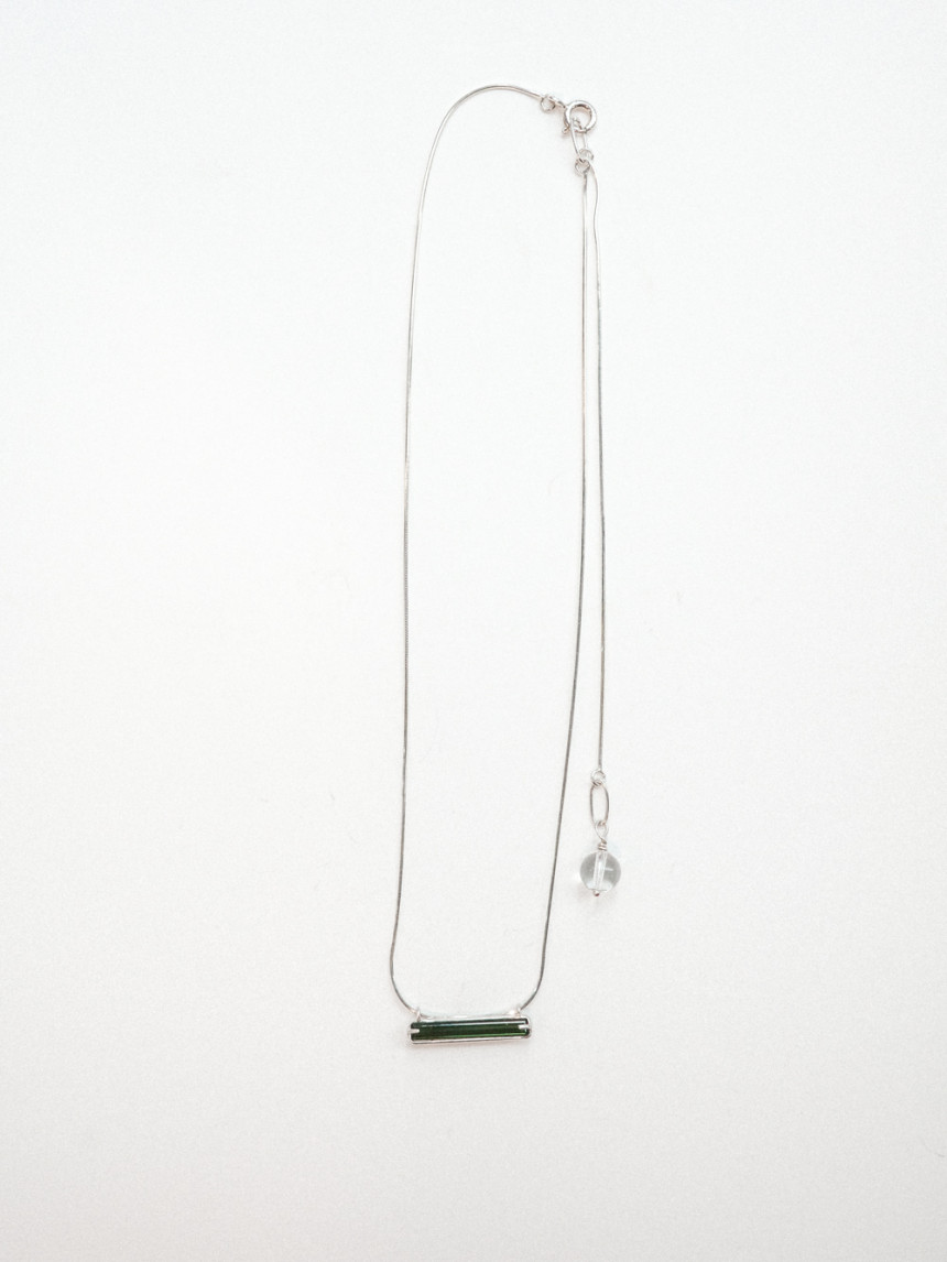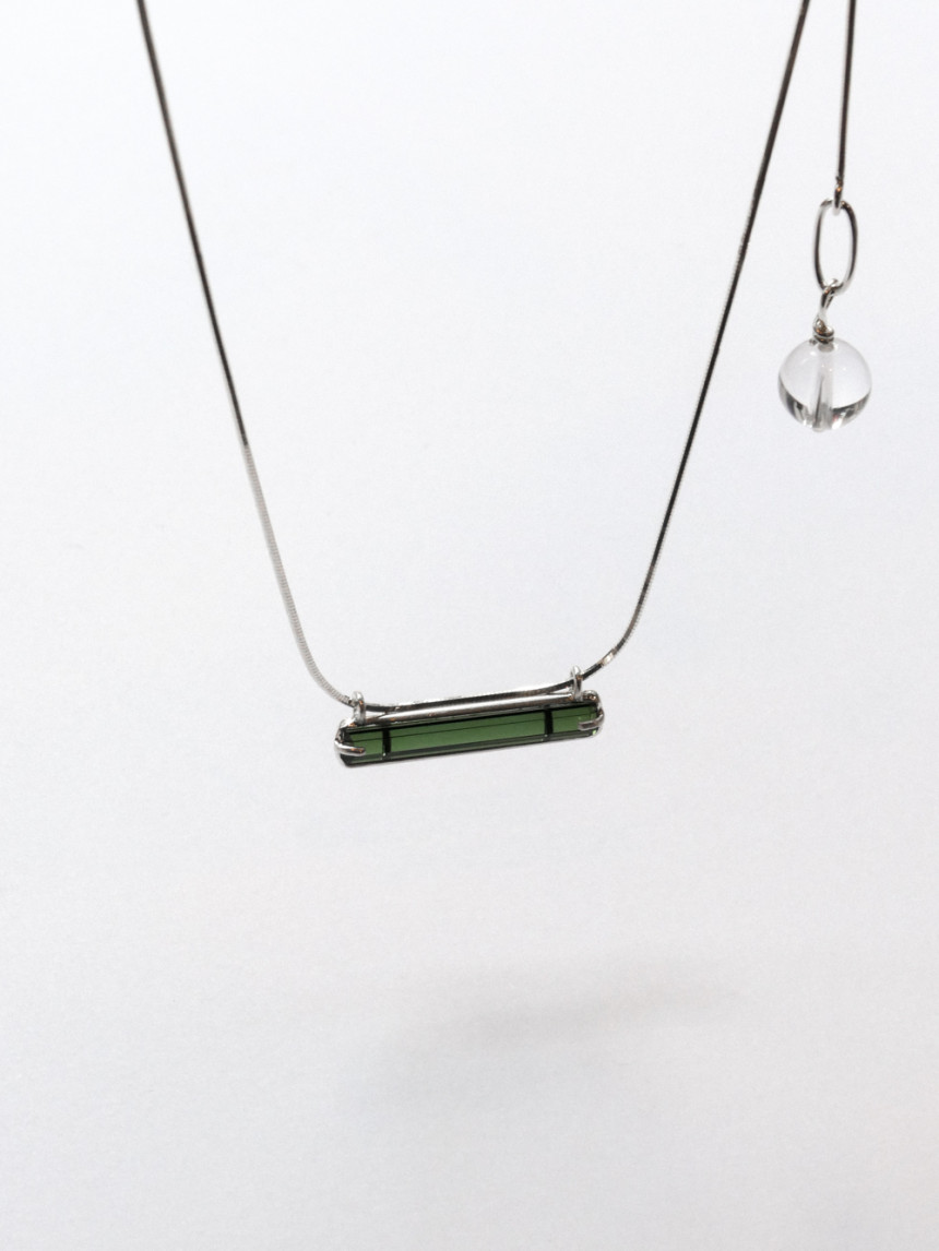목걸이 끝부분의 투명한 백수정 원석이 드롭되어